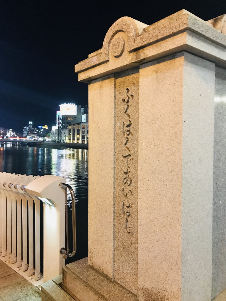 中州へ行くための橋の一つ。大きな橋で象徴的。中州側のであい橋の袂には三人舞妓の銅像があって見ごたえがある。銅像を真ん中にして、橋の入口が二股になっているのが面白い。橋からの眺めは夜景が綺麗。銅像の反対側の橋の袂では、中州はかた船の乗り場になっていて、観光名所の一つになっていた。