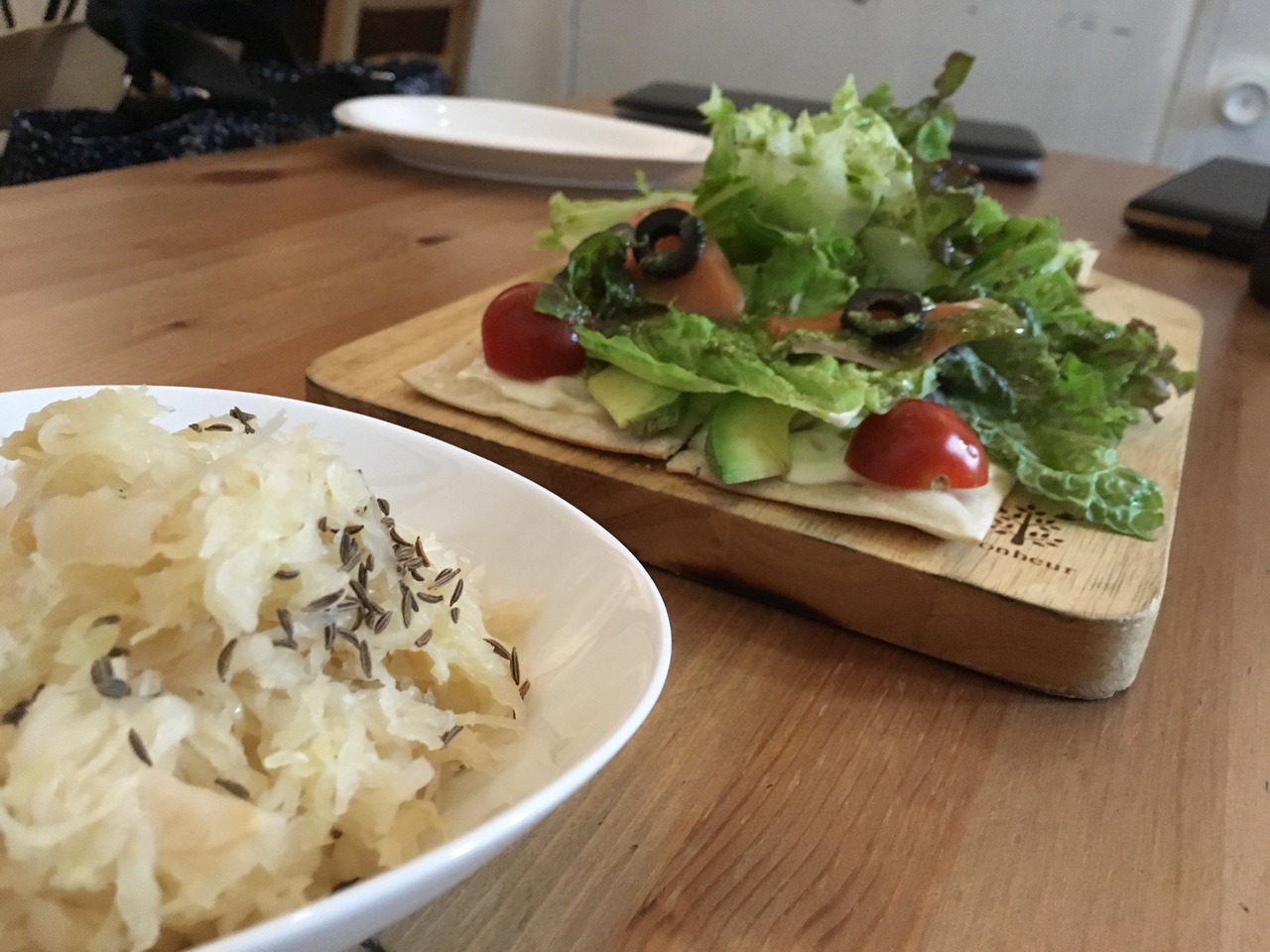 ドイツビールで乾杯してザワークラウトをつまみに喋っていると、まずはサラダ・フラムクーヘンが登場。パリパリの薄いピザ生地の上にサラダが乗っているというか、サラダの下にたまたまパリパリのピザ生地が敷いてあるというか。兎に角食べるのに苦労はするが、薄くてパリパリなのにしなやかで焦げていないという絶妙なパリパリが実に美味い。