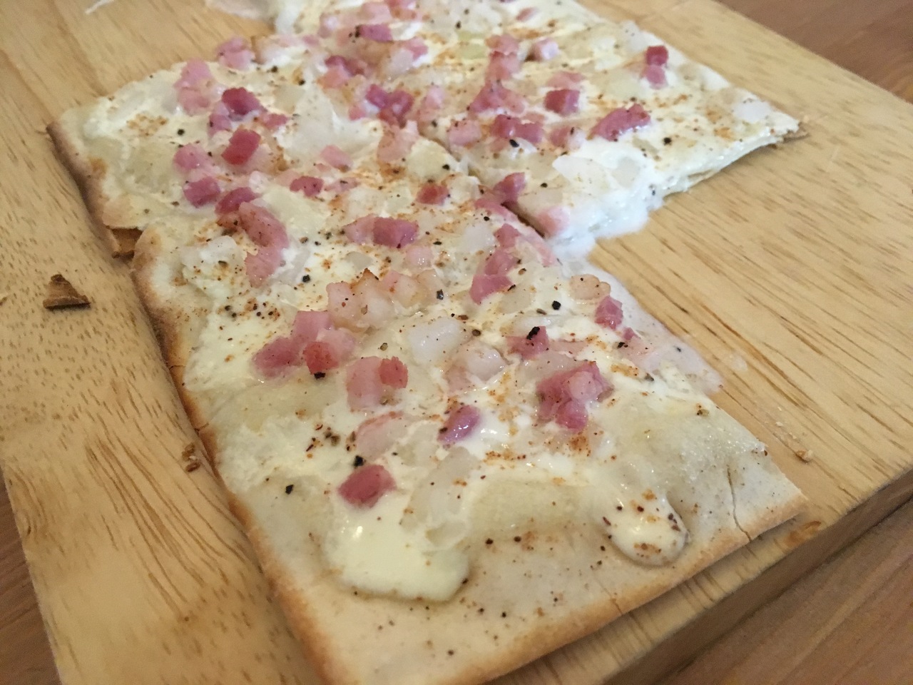 うっとりしているところへ続いてフラムクーヘン・クラシックが登場。「熱いうちにお召し上がりください」とのことなので、サラダそっちのけでクラシックにかぶり付く。ベーコン、玉ねぎ、チーズって最強だよね、と。この食感を求めてここまで来た甲斐があったもんだ。