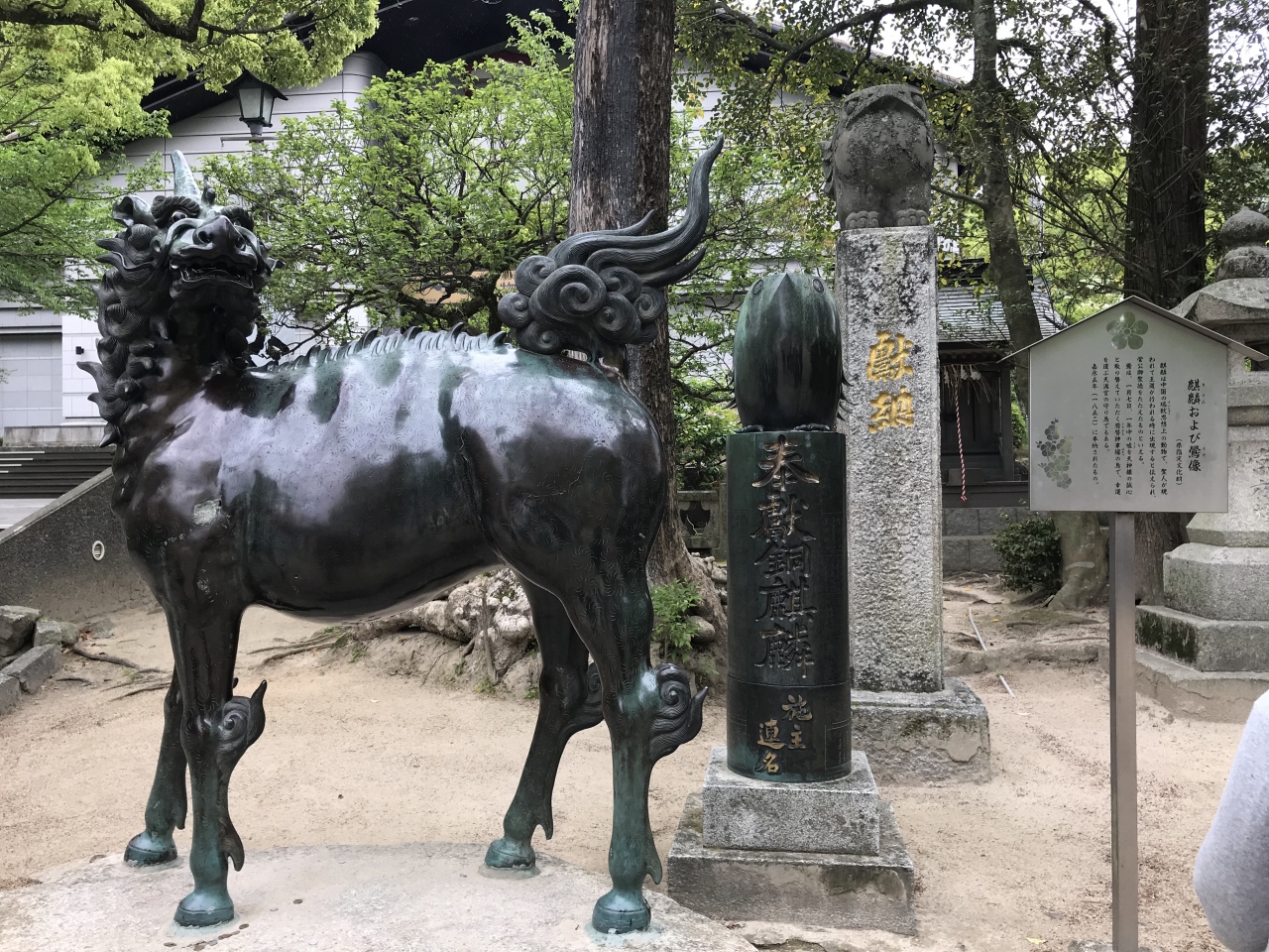 太鼓橋を渡り終えたらすぐ右手側に麒麟像が見えた。1852年に奉納された、新しめの像だけど、タテガミや目鼻など、造形がカッコ良い銅像です。記念撮影してる人が沢山いて、銅像だけの写真を撮るのが難しかった。