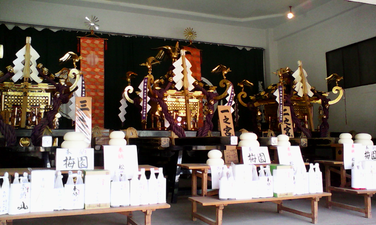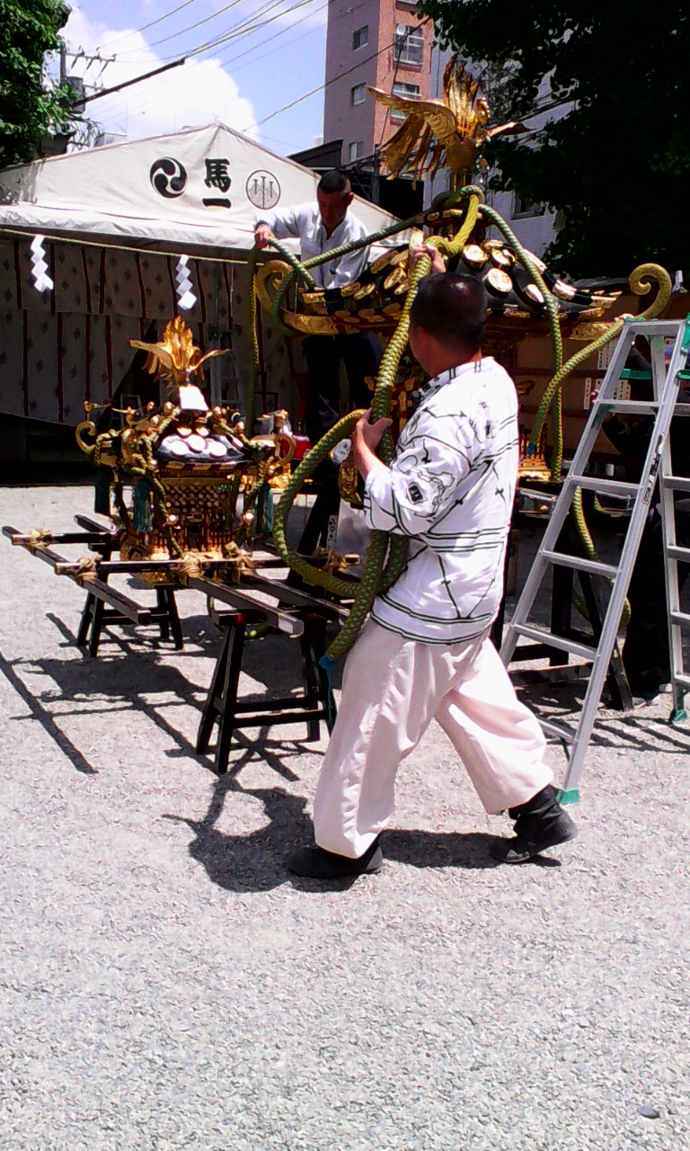 平日の午前中でも外国人観光客などでかなりの賑わいだったのですが、神社の裏手の方へ行くと、明日の祭りで使うらしい町会の神輿のセッティングをしていたり、一之宮、二之宮、三之宮のお神輿が並んで安置されていたりと祭りの舞台裏の様子を見ることができてちょっとお得な感じでした。