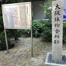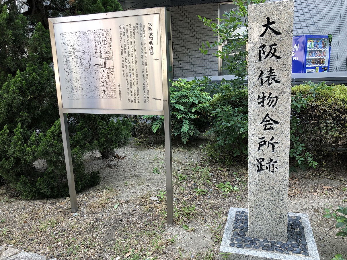 北浜の駅の近く「大阪証券取引所」の道をはさんで向かい側のビル前に碑と案内板が建っています。信号待ちをしていてみつけました。