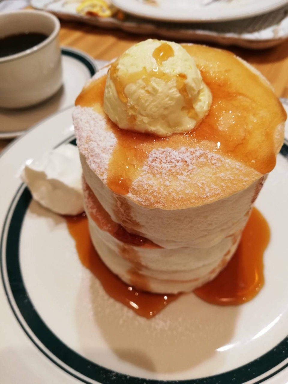岡山天満屋の地下タウンにお店があります。プレミアムパンケーキの時間は決まっていて、行列ができると聞いていましたが、この日は平日で雨が降っていたので、幸運なことに食べられました。ふわふわパンケーキが3枚重なっていて、高さにインパクトがありました。味はもちろんおいしかったです。