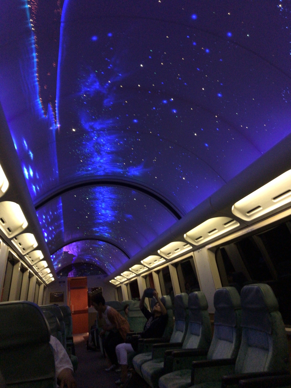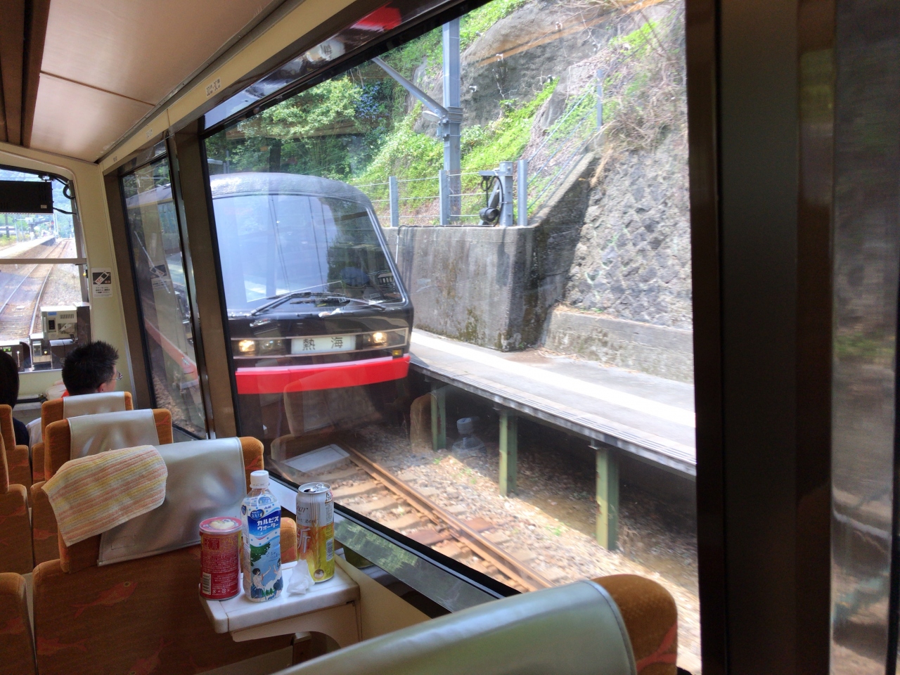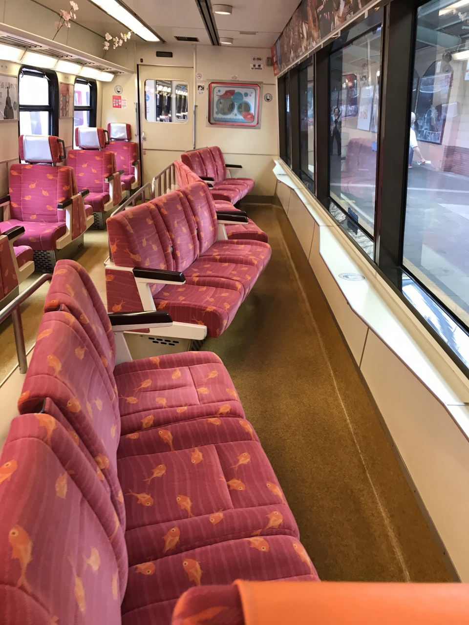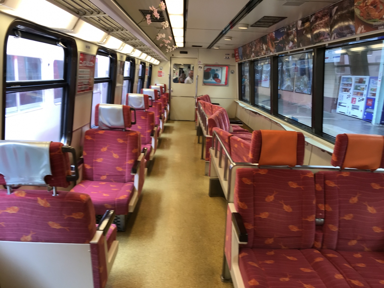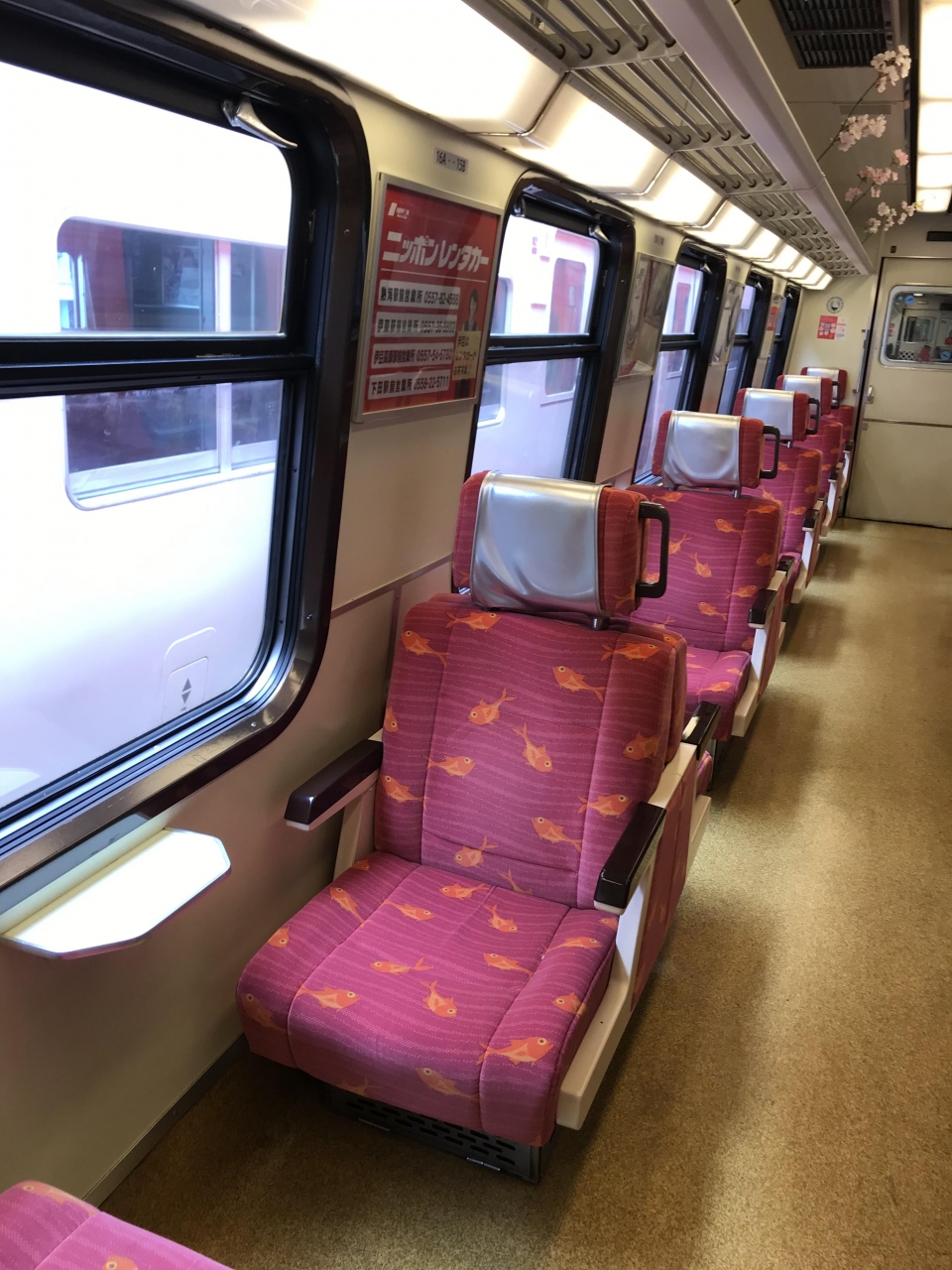 真っ赤なキンメ編成と真っ黒の黒船の2編成で、各先頭車両は6列の展望シートになってます
