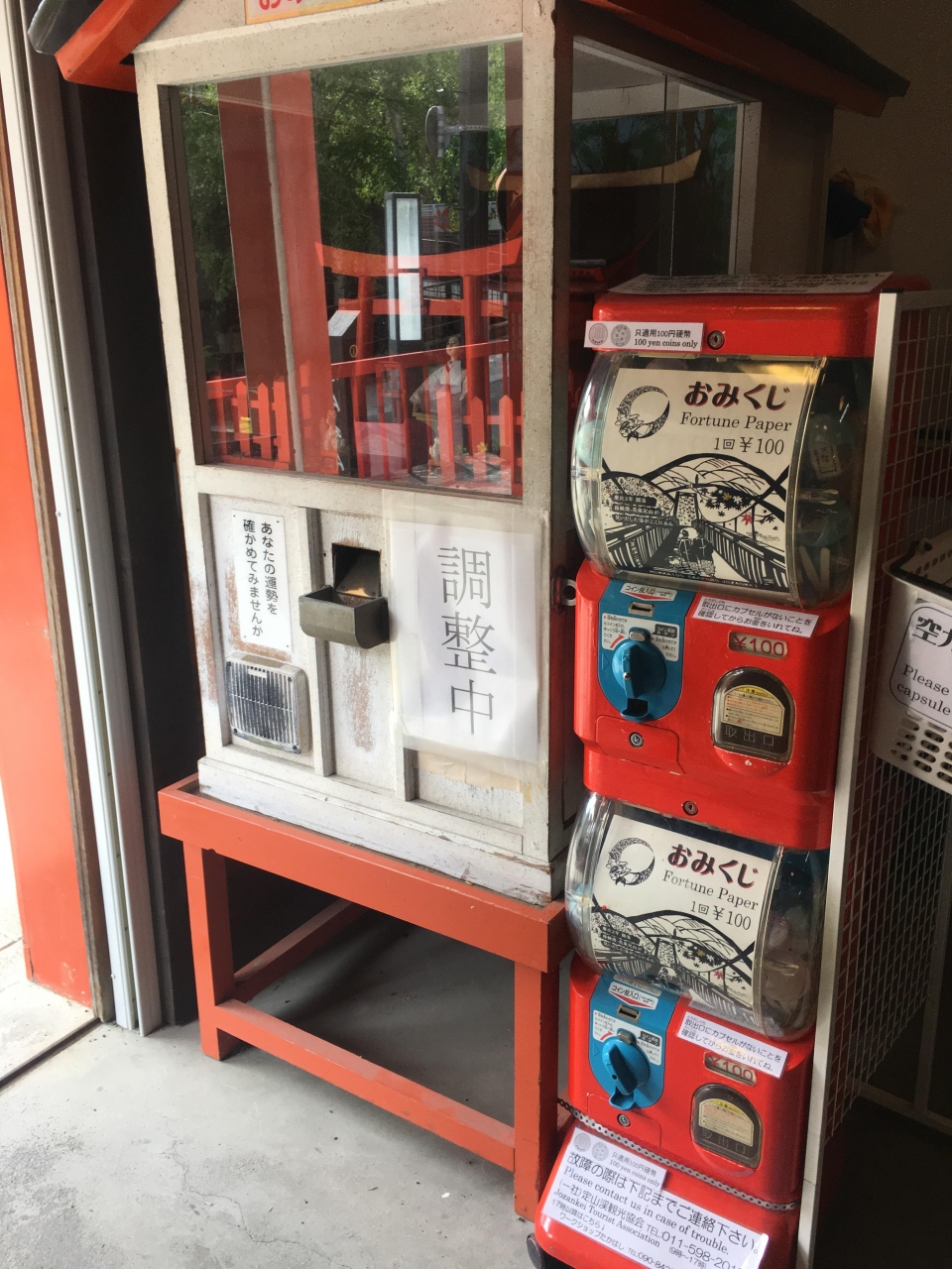 お堂の入口すぐ左手、ショーケース内に神社の模型と巫女さんの人形が入った占いの機械があります。すごく気になりましたが2019年6月時点で調整中となっていました。