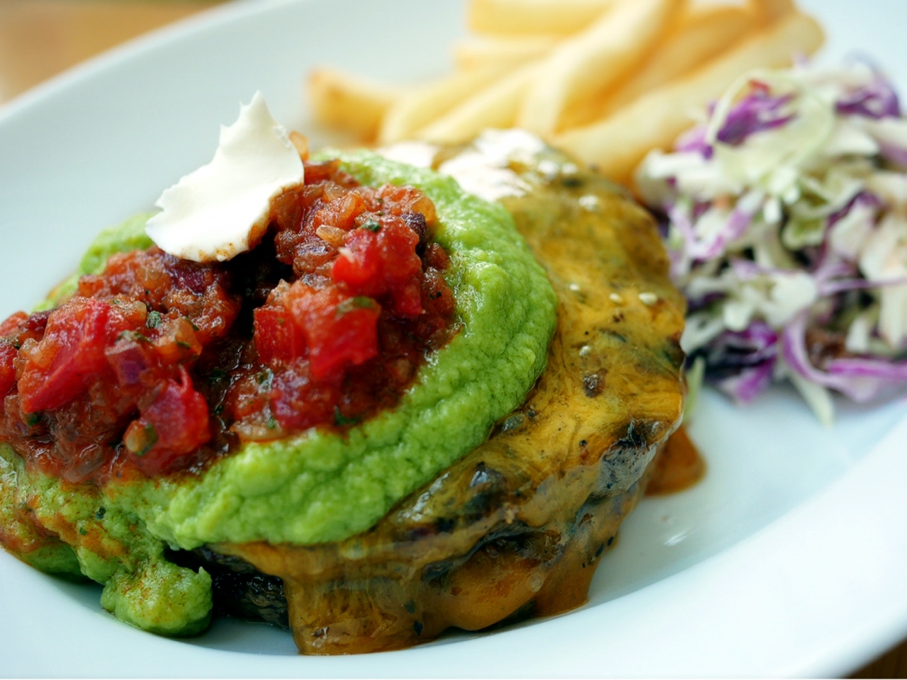パティには、チェダーチーズ、アボカドの摩り下ろし、サルサソース、サワークリームがトッピングされ、味わい的にはメキシカンです。