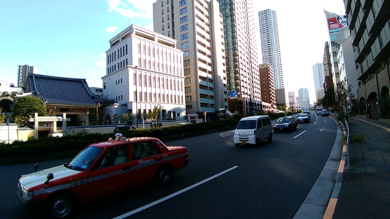 この寺の建物の日本伝統建築が、桜田通りに林立するモダンな高層ビル群と、対照的で素晴らしい
