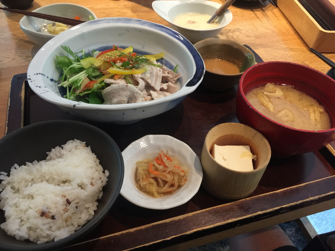 食べたのは豚冷しゃぶランチ1,300円!ここは御飯おかわり自由に加えとろろもおかわり自由でナイスです。料理の味も良く、コーヒー紅茶もサービスです。