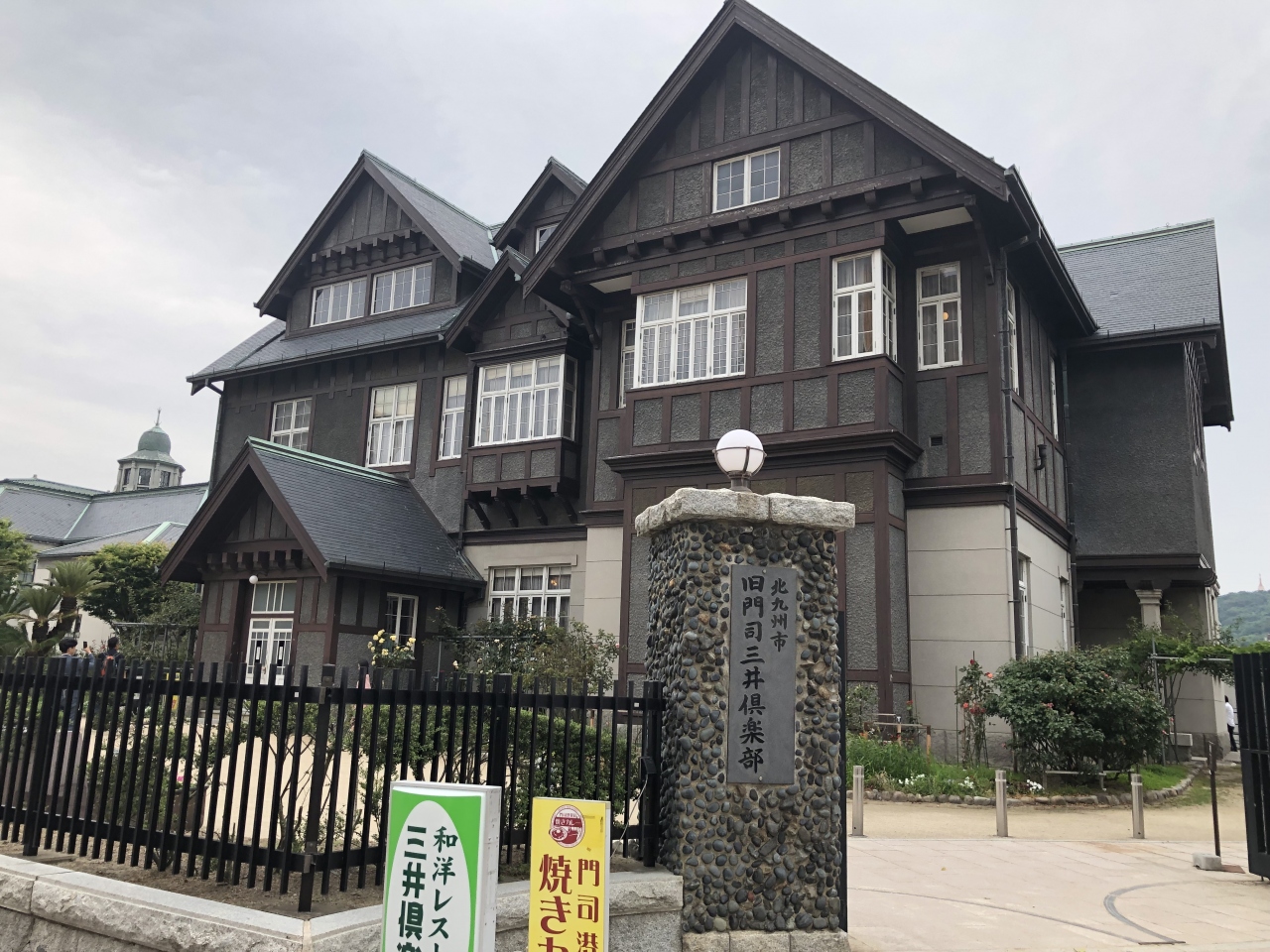 友達と門司港駅近くのお寿司やさんでランチ。食後の腹ごなしにレトロを散歩しました。秋にも来て中を見て回ったので、今回は裏門から入ってお庭を見て、表門へと移動しました。バラが終わり、青っぽい紫陽花が咲いていて、黒っぽいシックな建物と、色の対比が美しかったです。
