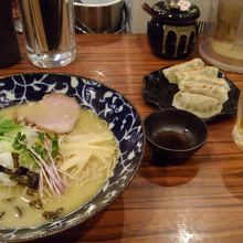鶏そば、何か別の名前だったかもしれませんが、一番人気だと言うので、選びました。ビールのあてに島豚の焼き餃子も頼んだところ、これが熱くないんです❗