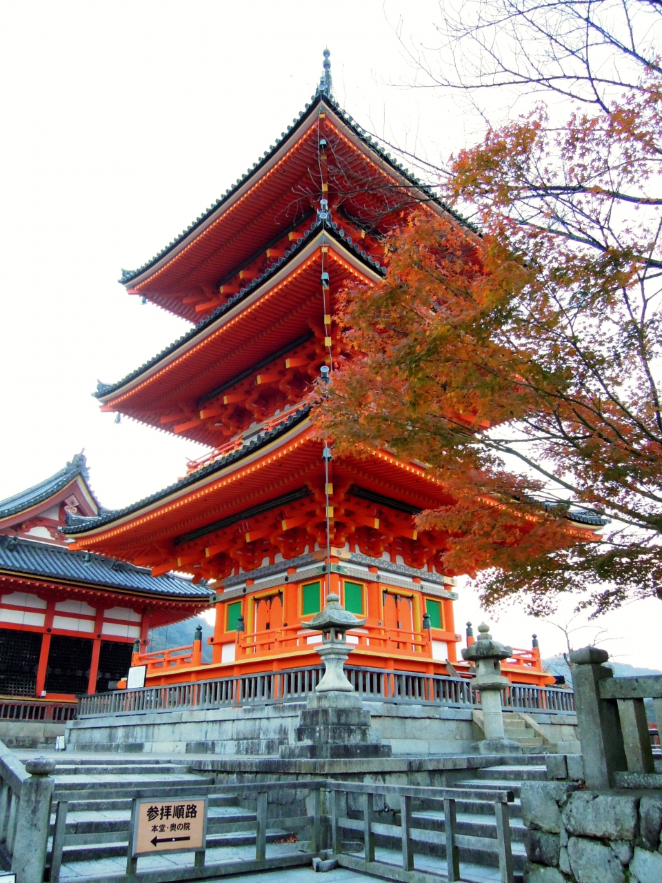これも清水の坂から見える建物の一つだ。西門の裏側にある三重塔。高さは約31メートルで、国宝や重文の三重塔では薬師寺東塔に次いで二番目に高いとされる。平安時代の創建だが、火災に遭っており、江戸・寛永年間に再建された。内部は公開されていない。清水寺の見どころの一つだ。