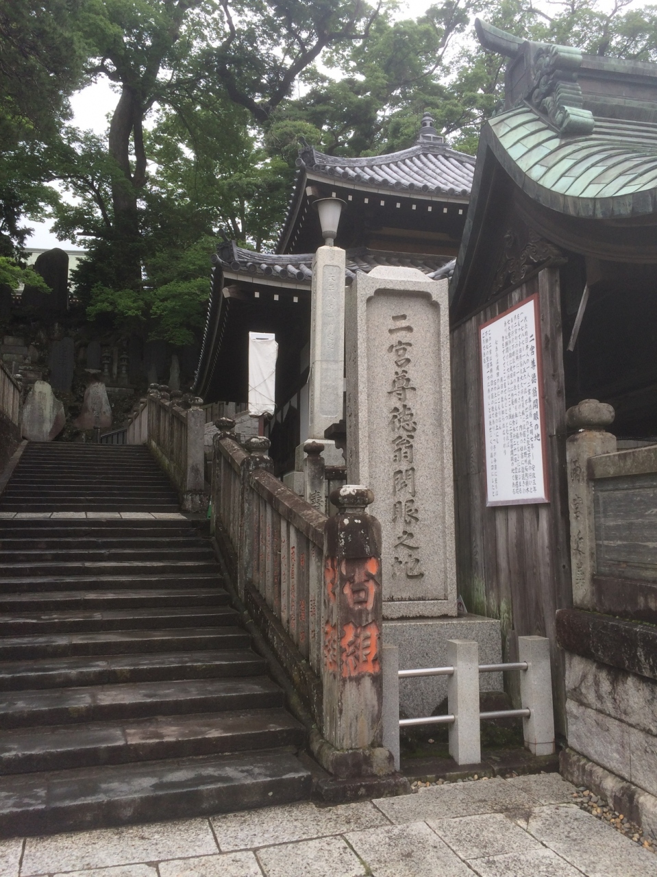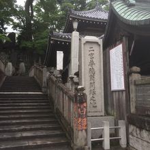 古びた建物の横に細長い長方形の石碑と説明看板があるのみで説明看板には長々と二宮尊徳を称えていました。石碑は石の台座にのっかっているような作りですぐ横は階段で、新勝寺本堂まで行くことが出来ますが脇道のような階段なので参拝客が少なかったです。