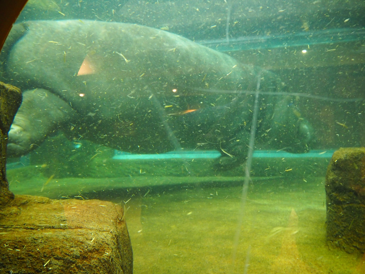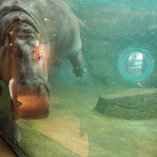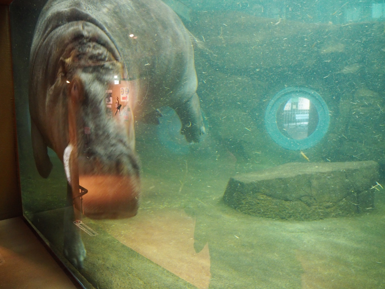 旭山動物園にあるかば館です。きりん舎のすぐ横にあるスポットです。かばは昼間は水の中にいて、夜に陸に上がり植物を食べる生態なので、観光客は動物園内では水の中にいるかばを見ることになります。かばは大きな太った姿ですが、水の中では軽やかに泳いでいるのが印象的です。また昼間はずっと水の中にいるので、水の中で排便するので、水は濁っていて、フンらしきものも見えます。においもかなりしました。