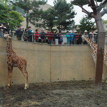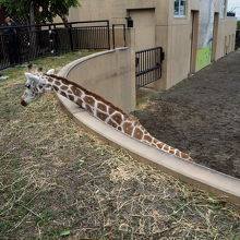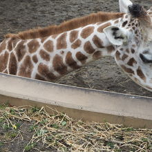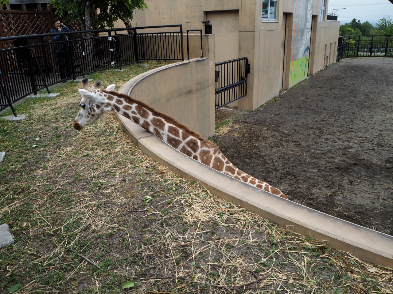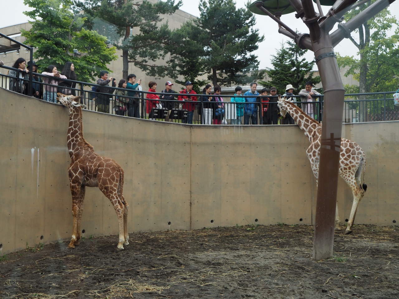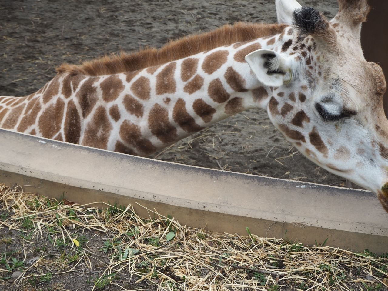 旭山動物園のきりん舎です。かば館のすぐとなりにあります。えさやりの時間に出かけましたが。えさ(葉、茎など)が観光客の柵のすぐ前に置かれるので、すぐ前には植物を食べているきりんの顔が見えます。もぐもぐと食べる顎の動かし方が印象的です。視線が観光客とほぼ同じのもいいです。青い新鮮な葉などは食べているのですが、少し茶褐色になった前日、前々日のものは見向きもしませんでした。