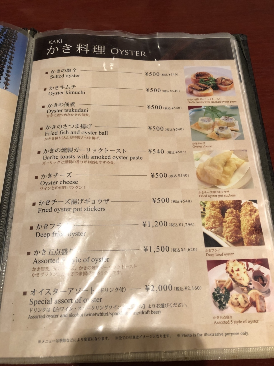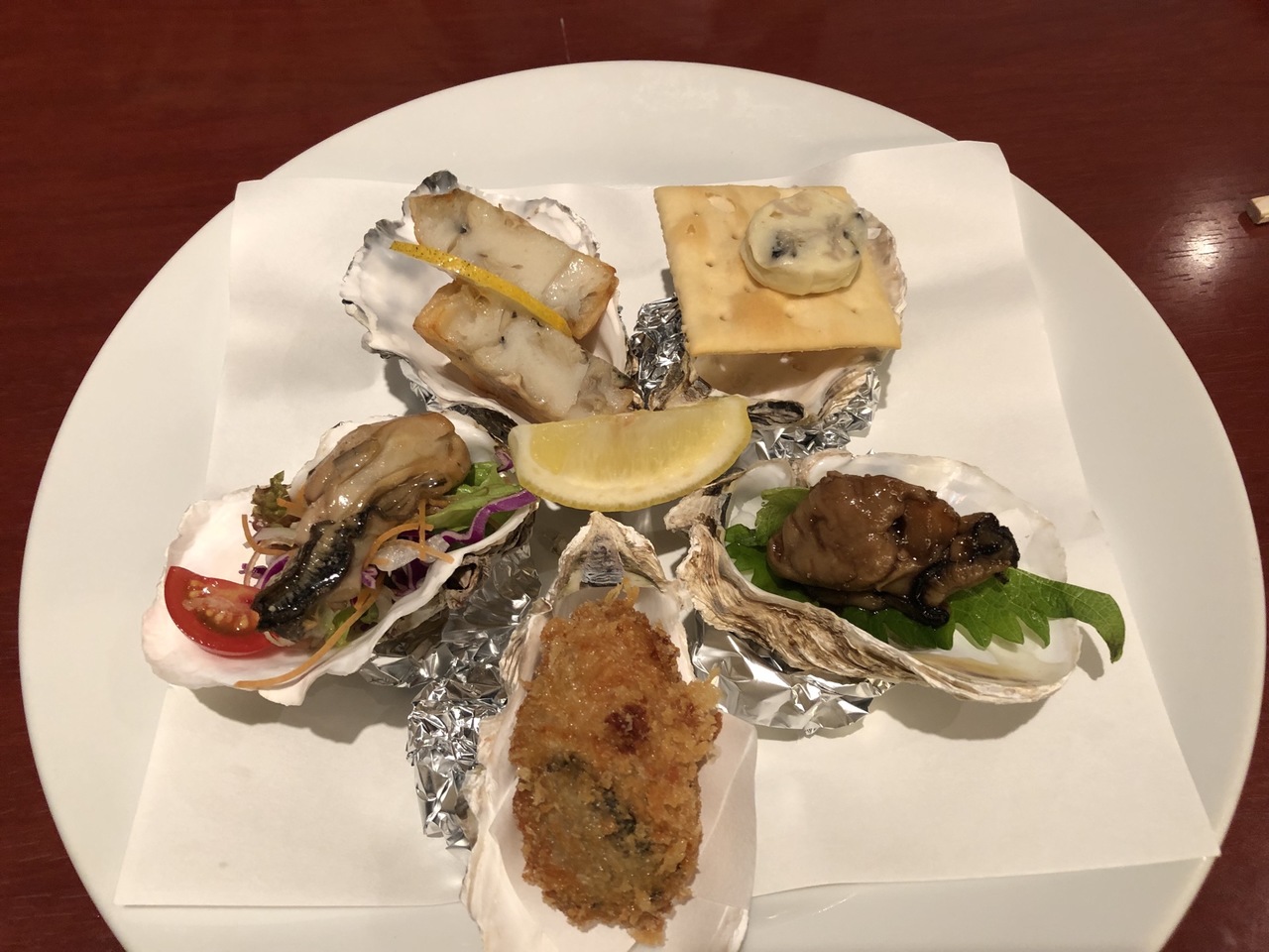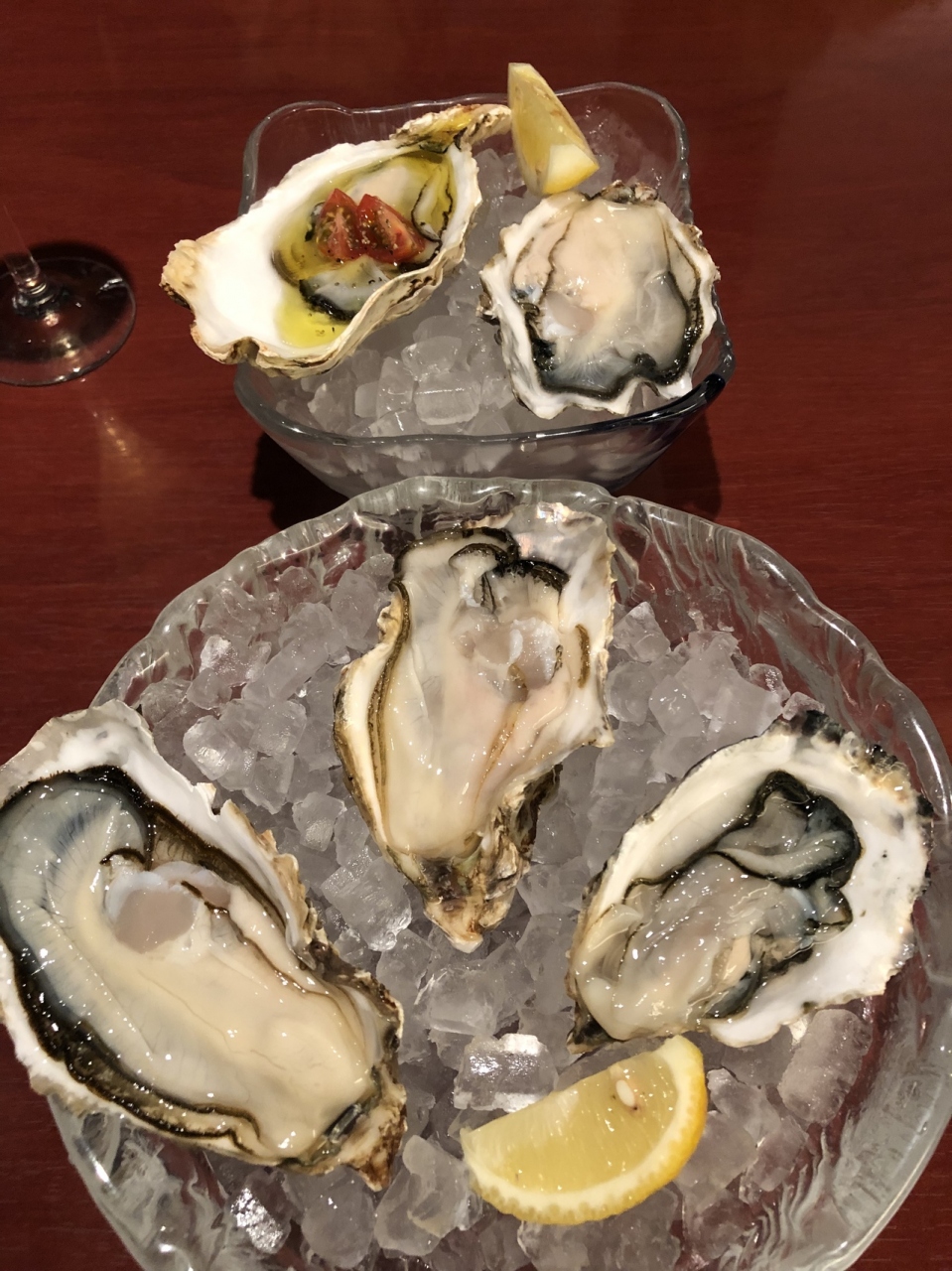 生牡蠣をはじめ、牡蠣フライなどの一品料理はもちろん、リゾットやパスタやオムライス等牡蠣を使用した洋食も充実しています。生牡蠣3種にアルコールがついた広島セット(1850円)に始まり、オイスターアソート(アルコール付き2000円)や和牛サラダ、牡蠣のクリームパスタなどを食べて白ワインも入れたので結構いいお値段になってしまいましたが、やはり美味しかったです。