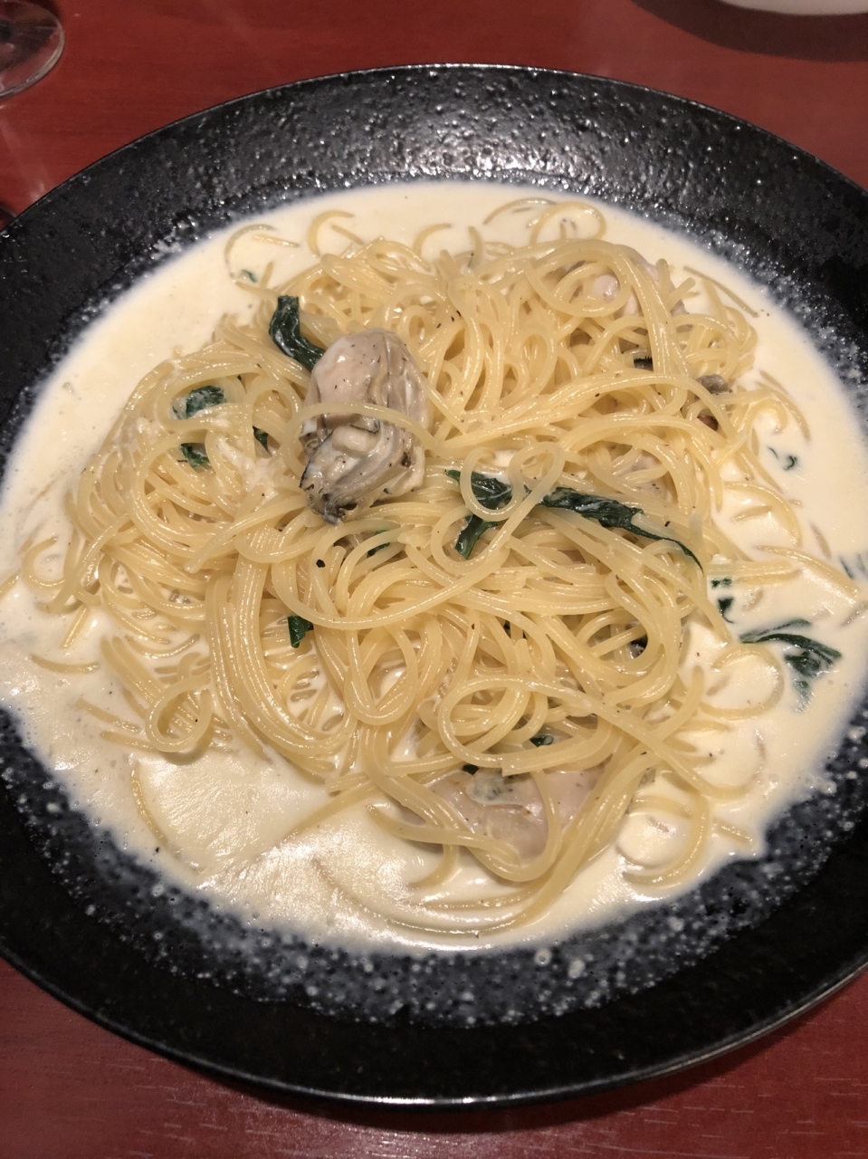 生牡蠣は一個550円ですが「広島」が大ぶりで味もしっかりしていて美味しかったです。パスタは味はいいのですが、もっと麺をアルデンテにして欲しかったな。