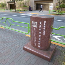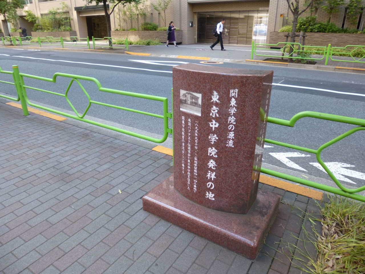 「東京中学院発祥の地」の石碑は、明石町を南北方向に貫く、居留地中央通り沿いにあります。この道沿いには数多くの石碑がありますが、その中でも目立つものでした。石碑には珍しい、ダークブラウンの色彩が特徴的です。「東京中学院」とは、現在の関東学院のルーツとなる学校のようです。