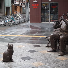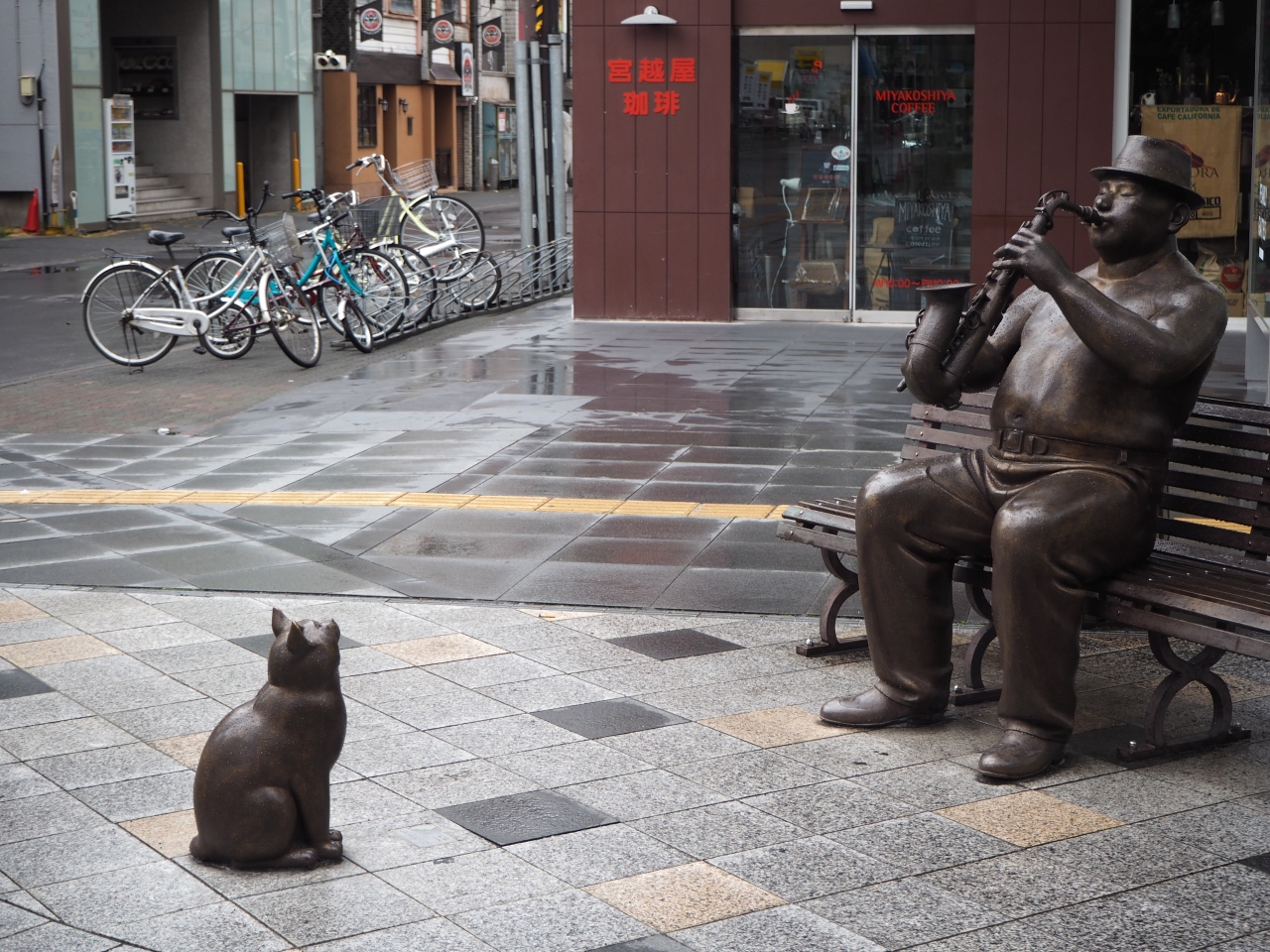 旭川駅から北へと続く平和通り買い物公園のちょうどなかほどにこちらの像はあります。人通りのある通りの少し端のほうに像はあります。等身大ほどの大きさの像で通りを歩いていると見逃すことはなさそうです。サキソフォンを吹いているおじさんとその前に座る猫がとてもかわいらしい感じです。思わず足を止めて写真を撮りました。サキソフォンのおじさんの横は座れるようになっていて、一緒に写真も撮れます。