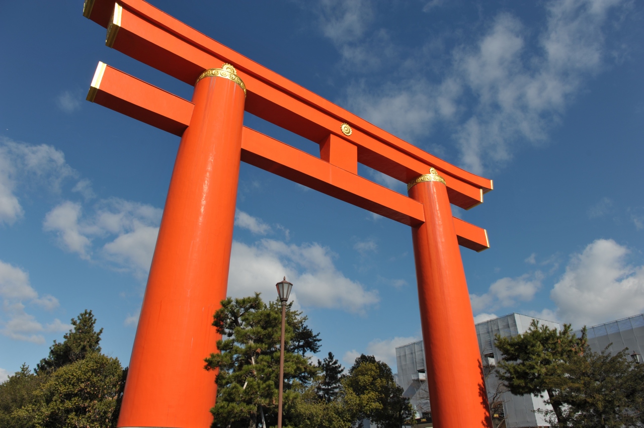 この鳥居を見ると「京都」あるいは「京都に来た」とひしひし感じる。平安神宮建設時は神殿にふさわしい巨大な鳥居の建立を可能にする石材や木材の調達が難しく、鳥居ができたのは1929(昭和4)年だった。巨大鳥居の場合、あまり派手な色は用いないが、ここは見事な朱塗りだ。神殿と少し離れてはいるが、訪れたいスポット。