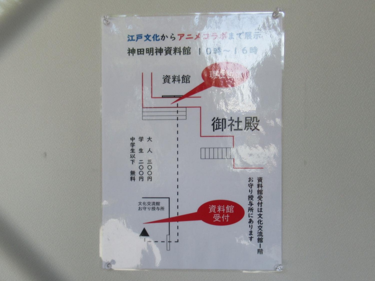- 神田明神の御社殿の左脇なのでJR御茶ノ水駅聖橋口からほぼ北東方向に歩いて5分位なのでまぁまぁだが資料館への地下通路が一苦労です