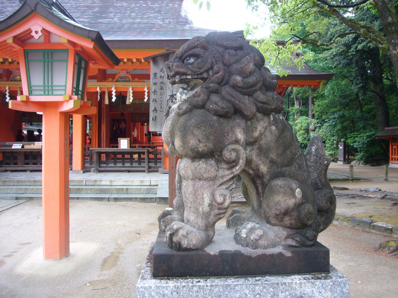 別府までのJRの時間が少し余裕があったので、博多駅からぶらぶらと散歩気分で訪れました。「住吉神社」は全国に2000社以上あるそうですが、ここ博多のは最初のだそうで、古書にも「住吉本社」「日本第一住吉宮」などと記されているそうです。境内はしっとりと落ち着いていて、とてもいい雰囲気でした。「住吉造」と云われている社殿は、国の重要文化財に指定されているもので、狛犬さんとも併せてなかなかのもんでした。