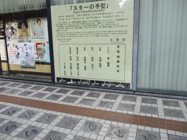 東京メトロ浅草駅から雷門(風雷神門)をくぐり淺草寺本堂方面に仲見世通りを進み浅草伝法院通りからオレンジ通り沿いの浅草公会堂玄関前に芸能人の手形とサインが刻印されたプレートが敷き詰められたスターの広場があります。スターの広場は渥美清さん、萩本欽一さん、ビートたけしさんなど浅草にゆかりのある人物や各分野で活躍の著名人のプレートを探すと憧れのスターを身近に感じられますのでお勧めします。意外と手が小さいスターが多かったです。