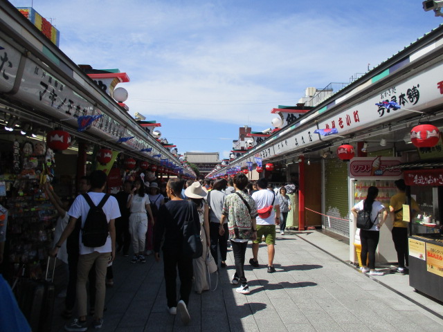東京メトロ銀座線浅草駅から雷門(風雷神門)をくぐれば日本的情緒な仲見世通りに歩いて5分ぐらいで着きます。仲見世通り沿いは揚げまんじゅう、人形焼、せんべい、ソフトクリームなど食べ歩きショップが多く、店舗の前で立ち止まって人が食べてるので若干歩きづらいもどかしさがありますが東京観光のメッカとしては観光客が多く嬉しい限りです。外国観光客の着物姿が多く狭い仲見世をそぞろ歩きは迫力あり見ごたえあります。仲見世に約90店舗が商売してるそうです。外国観光客が多いので刀、着物を扱っているショップもありますし、人形焼の実演様子も見れます。揚げたての揚げまんじゅうが美味しくお勧めです。