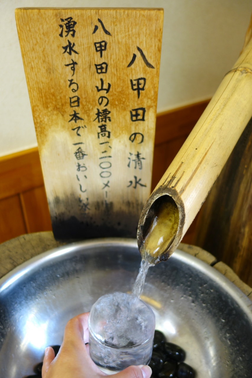 中のテーブル席はメニューいろいろで食券を買うタイプ。セルフのお水は八甲田の湧水、めちゃめちゃおいしいのでぜひ飲んでください。谷地温泉のお水を思い出しました。持ち帰りたいくらいおいしかったです。