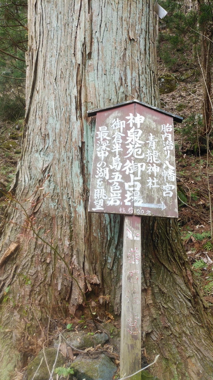 十和田湖の休屋駐車場に車を停めて湖の畔を15分程歩くと、開運の小道十和田神社の標識があるので右に行くと、金色の鳥居と鳥居の奥の岩に洞穴があり、「火ノ神」「山ノ神」「金ノ神」「天ノ岩戸」「日ノ神」「風ノ神」と続いている参道を過ぎて森林の大木を通ると大きな鳥居があり、手水車を過ぎると階段手前にまた鳥居がありました。階段を登ると本殿がありますが何とも云われぬ静寂さが神秘的で、社務所で御朱印を頂きました。境内にある祠は熊野権現と稲荷神が建っていて、その先の大木に、胎内潜り八幡宮「青龍神社」神泉苑御古場 御倉半島五色岩 最深中の湖を眺望と書いた立札に⇒があった先を見ると階段がありましたが、まるでジブリの映画で見たような光景で、何かやばそうな景色だったことに加え時間も無かったので乙女の像を見に行きましたが、何か伝説が多そうな感じがしました(興味のある方は検索して下さい)。途中でまた中国人の団体と会いました。中国人が青森に多いと言ってましたが本当でした。