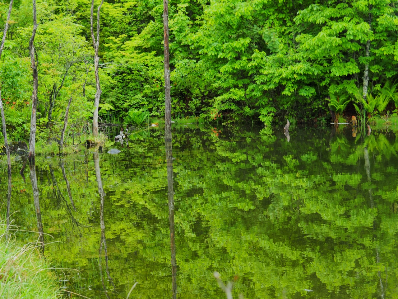 人がほとんど居なかったので、何処をどう廻ったらいいのかわかりませんでしたが、案内板を見つけて散策しました。まいめの池は、水面に木々が映っていて綺麗な池でした。天気が悪かったのもありますが、新緑の綺麗な6月、観光客の人がほとんど居なかったのが不思議でした。自然をたっぷり体感できる良い散策コースです。