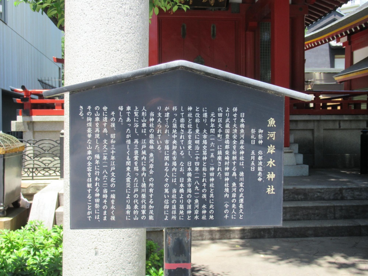 その後、水神社と改称し更に明治24年 (1891) 魚河岸水神社と社名を変更し、日本橋魚市場の守護神として崇敬されている。