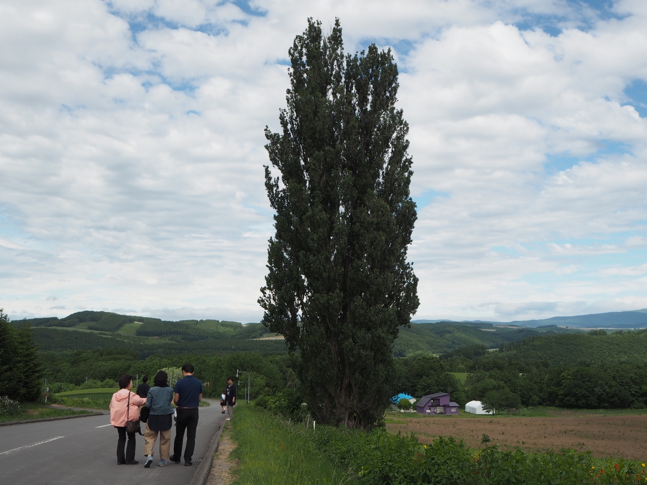 ケンとメリーの木は美瑛郊外の人気の観光スポットです。美瑛郊外の丘陵地の農地のすぐ横、道路に面してポツンと1本のポプラの木の巨木が立っています。1972年に自動車会社のテレビコマーシャルの撮影スポットになり、人気の場所になったところです。ポプラの木の樹齢は70年ほどで、テレビコマーシャルからすでに50年ほどは経っているので歴史をすごく感じます。木の周りには何も障害物がないので、その大きさが際立つようです。木の後ろは大雪山山系の山並みが見れるので、これをいれるのがいい撮影ポイントです。