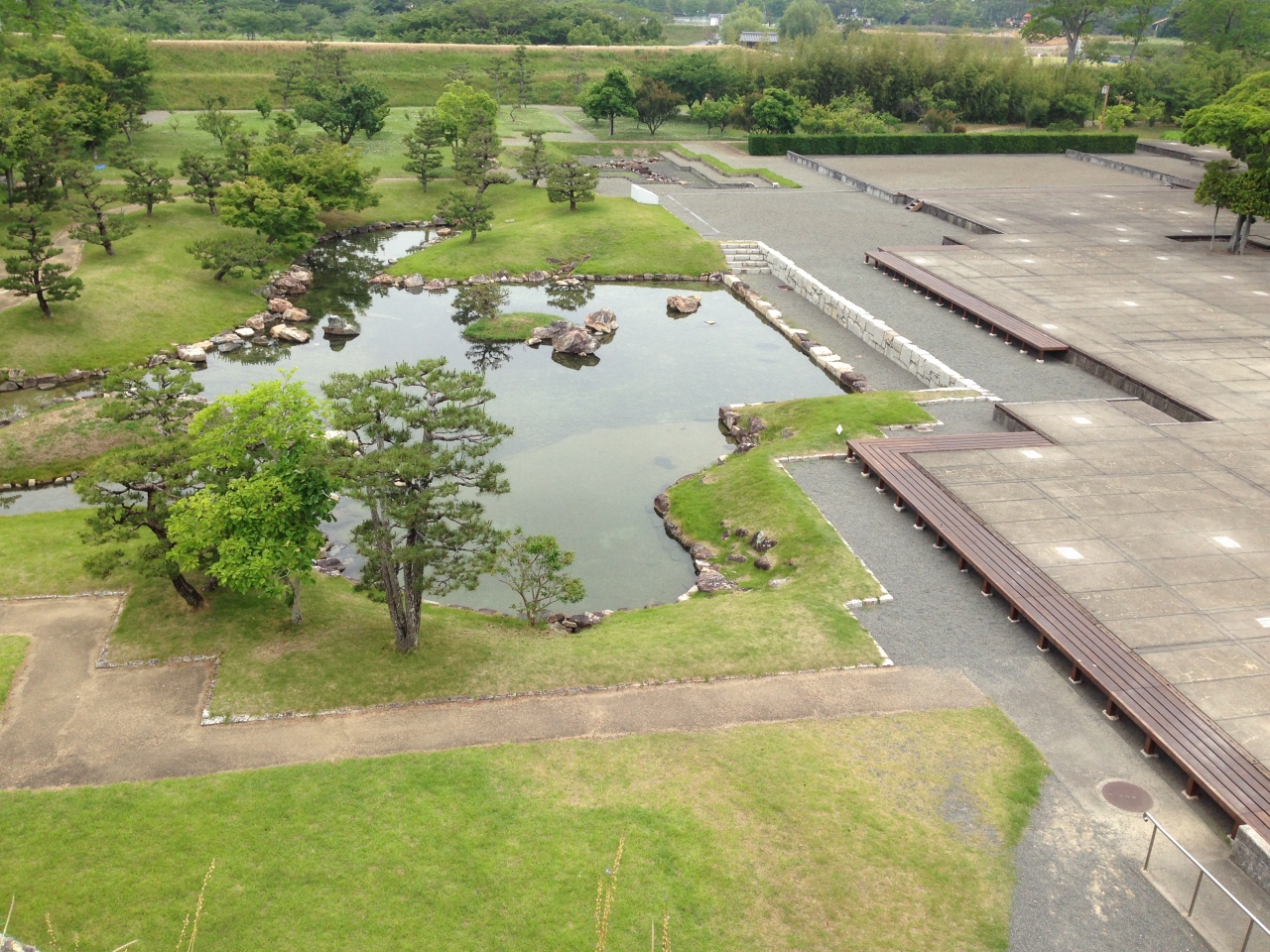 本丸御殿跡を中心にお堀に囲まれて、整備された庭が広がっていました。天守台跡が有り一段一段が高い階段を上がると庭園を見渡せて、こじんまりしていたことがよく分かりました。駐車場は歴史博物館横を利用したので、5分程歩きました。