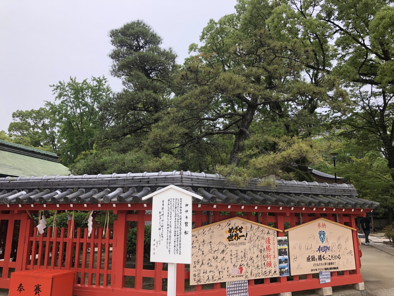 筥崎宮の紫陽花が見頃だというので、見に行きました。早く着きすぎてしまい、開演前、周囲を散歩しました。朱色の柵に囲まれた松がこれで、筥崎宮の御神木です。難関突破、必勝祈願にご利益があるようで、ホークスを始め、いくつもの絵馬が掛けられていました。