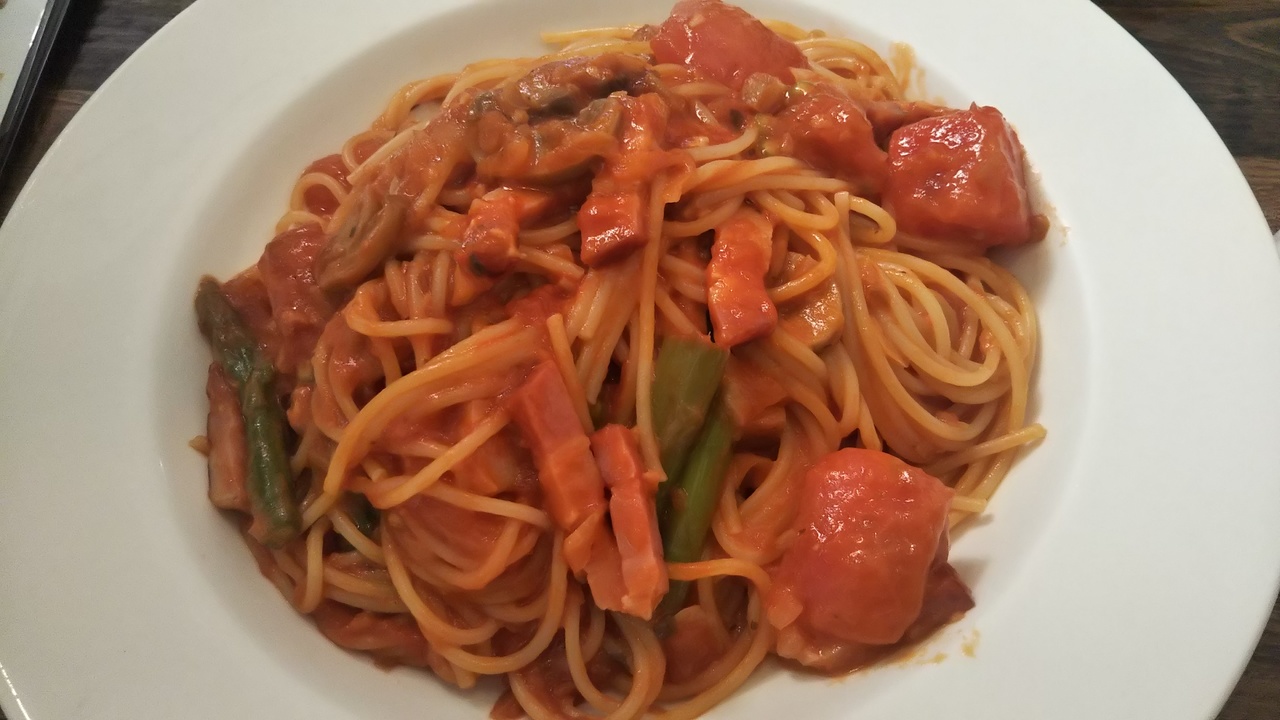 土曜日の昼でしたが、既に満席でした。家族連れや常連客が来ている感じでした。タッチパネルのタブレットから選びますが、ほかのイタリアンの店にはないメニューが多く迷いました。サラダの豆腐とドレッシングも美味しかったです。パスタはトマトソースベースにしましたが、美味しかったです