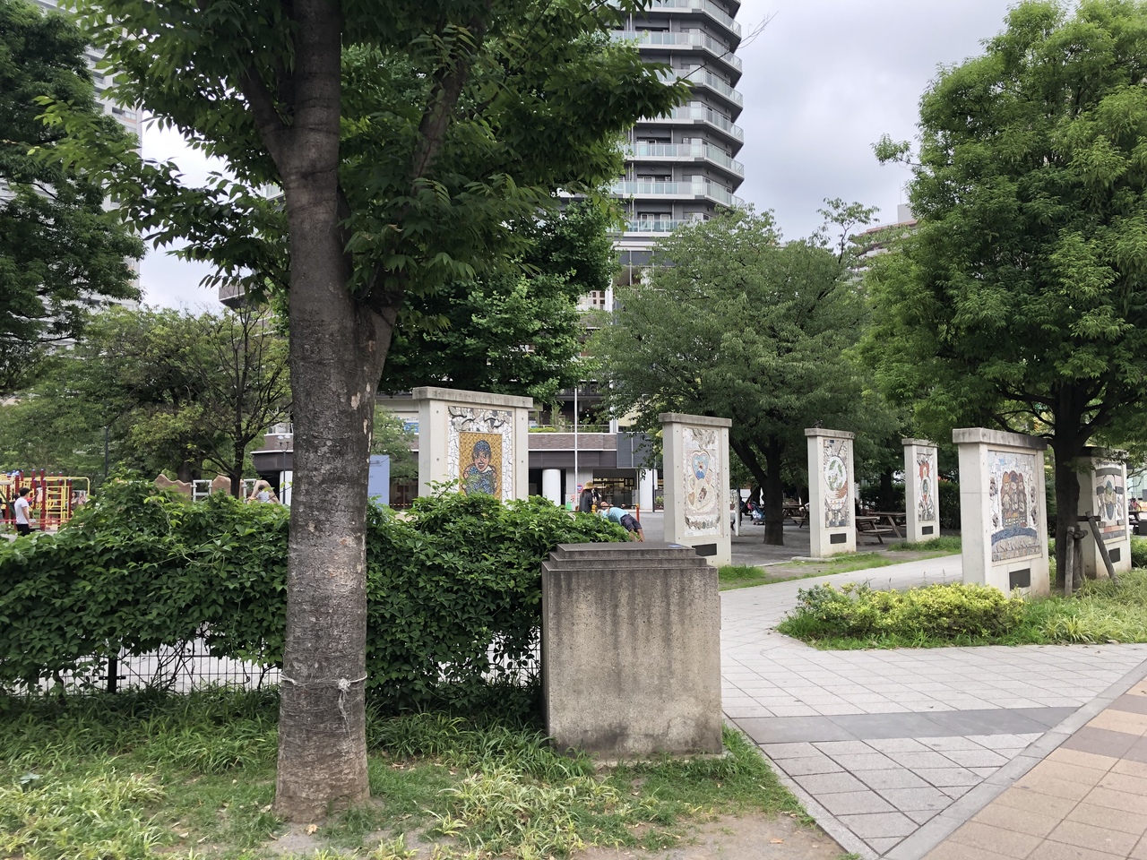 地域の学生たちで作ったと思われる、世界平和を願うモザイクタイルのモニュメントが沢山飾られていて、ちょっと独特の景観となっています。数は多くはありませんが、ベンチなども設置されていて地元の方の憩いの場となっていました。