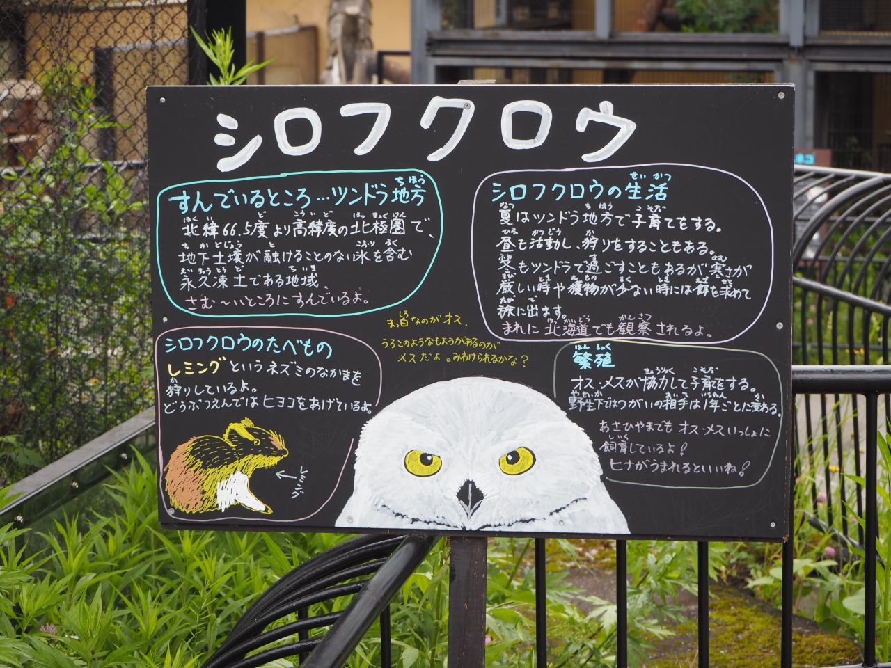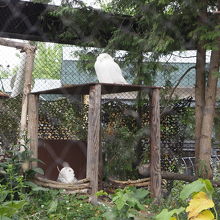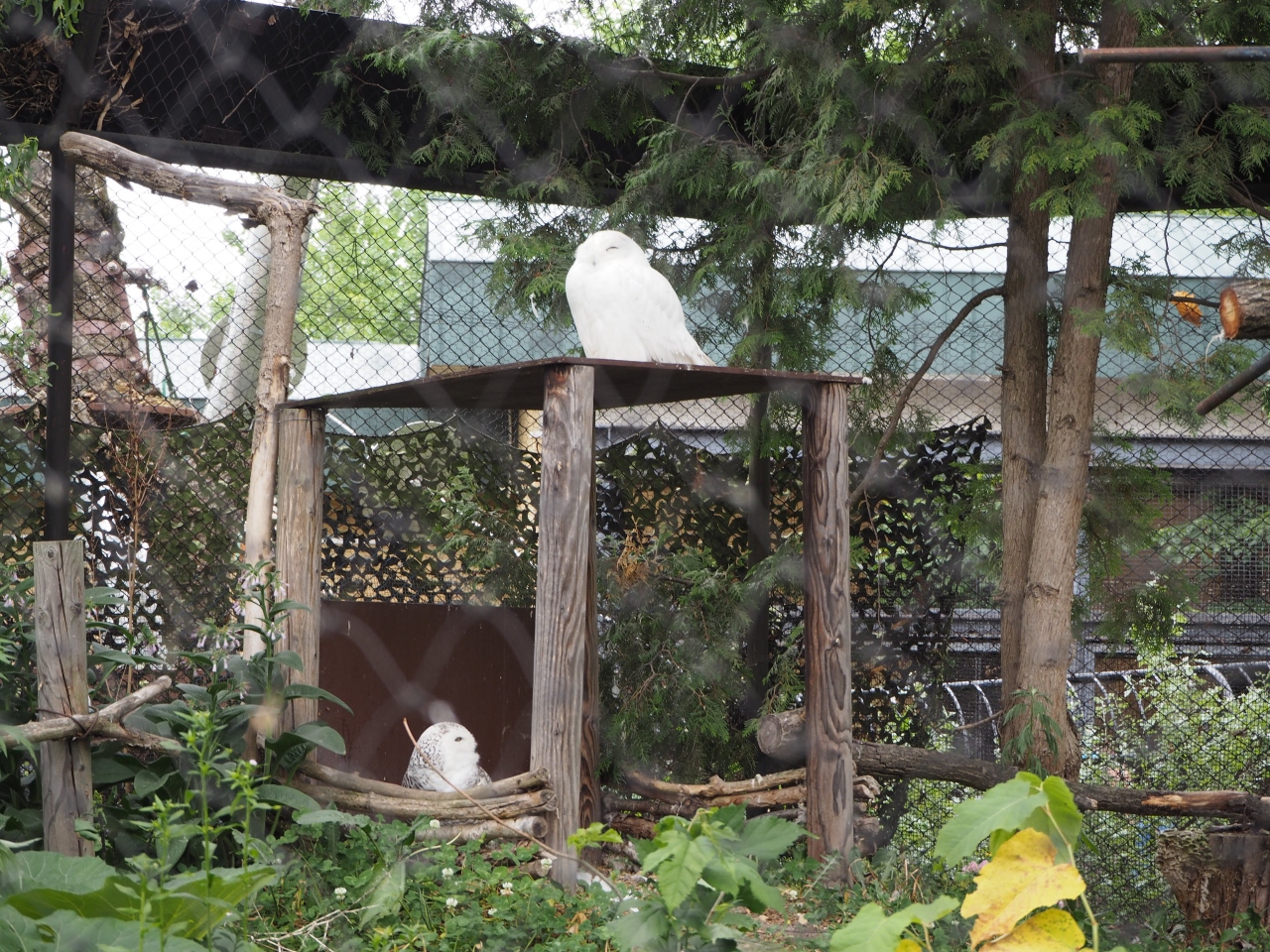 旭山動物園のシマフクロウ舎です。折りの中は大きな木と草むらがあるミニ森のようなおりのなかの環境です。そのなかにシマフクロウはちょこんと座っていました。真っ白のからだで少しぽっちゃりとした感じでした。あまりにも淡色の白い色が印象的でした。シマフクロウは昼間というのもありじっと動かずにいました。