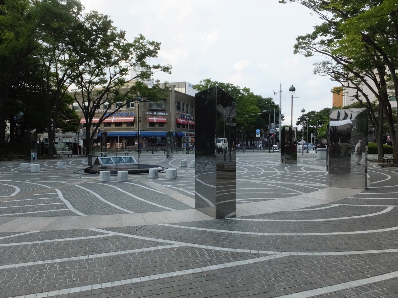 公園の中心には銀色のおそらくはステンレスの列柱が並んだ丸い空間があり、その中心には三角形のガラス屋根で保護された旧横浜居留地煉瓦造下水道マンホールがあります。また、公園の北の端っこには球形の日米和親条約締結の地の碑も。