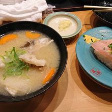 回転寿司ですが、ほとんどのお寿司を直接握ってくださりました。お味噌汁も出汁が出て美味しかったです。