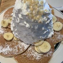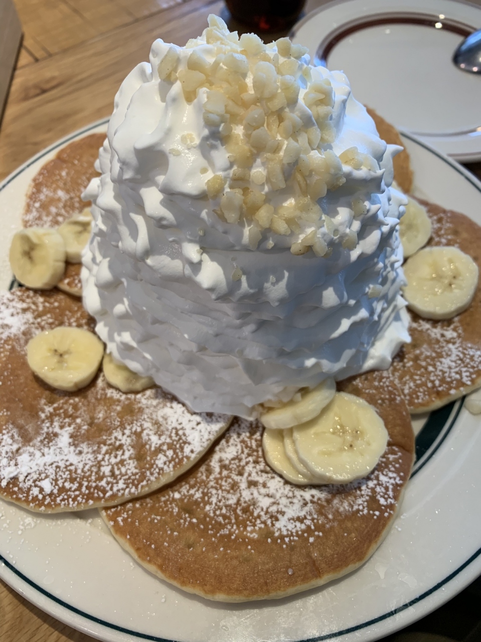 ここへ来るとやっぱりパンケーキを頼んでしまいますね~。ランチでしたが、お肉料理も食べ、パンケーキも食べおなか一杯になりました。2階まで吹き抜けた店内からは、レインボーブリッジが見え、落ち着ける雰囲気でした。