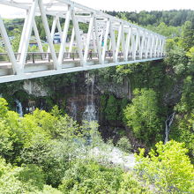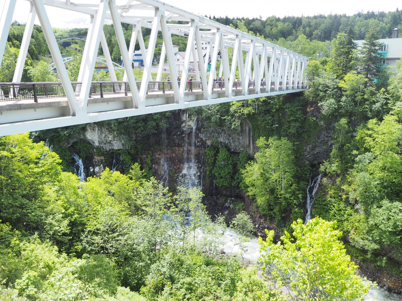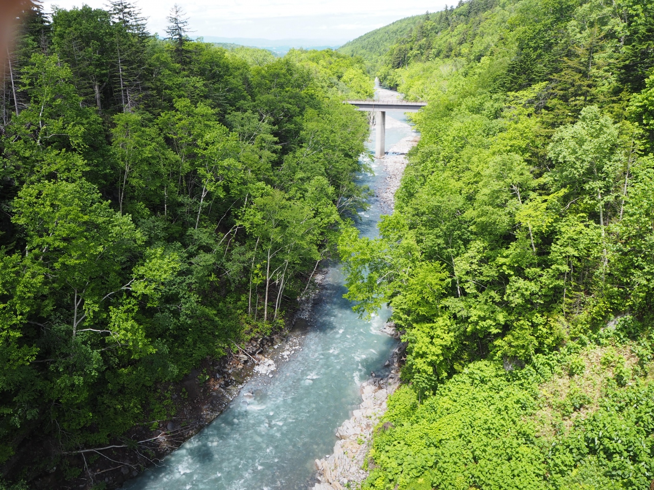 美瑛町の郊外にある観光スポットの青い池や白髭の滝に出かけました。この2つの場所を流れている川が美瑛川です。美瑛川は下流では石狩へと流れ込んでいくようです。美瑛川の美しく見える場所は、少し山あいに入った白髭の滝(白金温泉)です。美しい美瑛川の流れが楽しめます。山の深い渓谷にエメラルドブルー色の川の水と山の斜面の新緑の緑色の色あいがとてもきれいです。