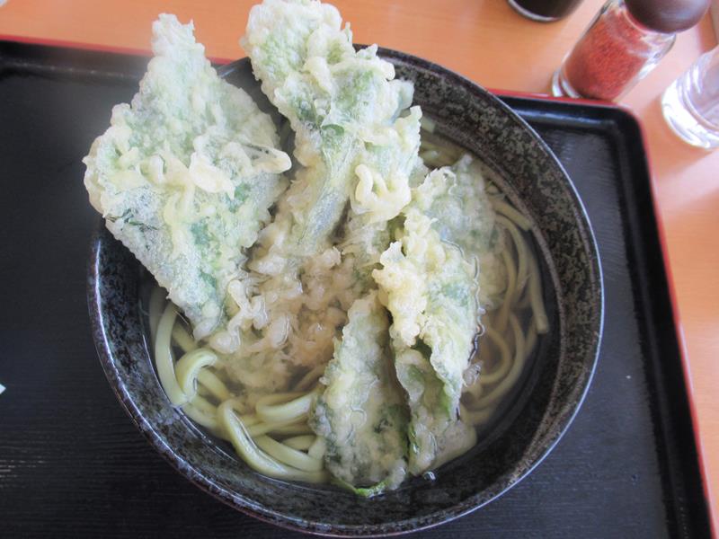 それよりもこのあたりの名産品の明日葉を使った明日葉うどんがよかってです。明日葉を練りこんだ緑色のうどん、その上に明日葉の天ぷらが載っていて500円。お値段もお手頃でおいしく頂きました。