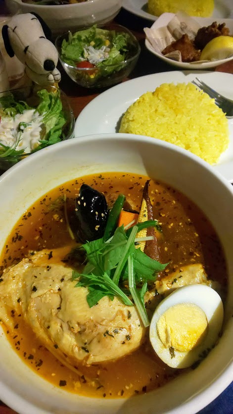 今まで行ったスープカレー屋さんの骨付きチキンは、ほろほろと骨から簡単にはずれるところが圧倒的に多かったのですが、ここの骨付きチキンはそこまで柔らかくは煮込まれていないようで、骨からきれいにはずれなかったし、食感も固かったです。