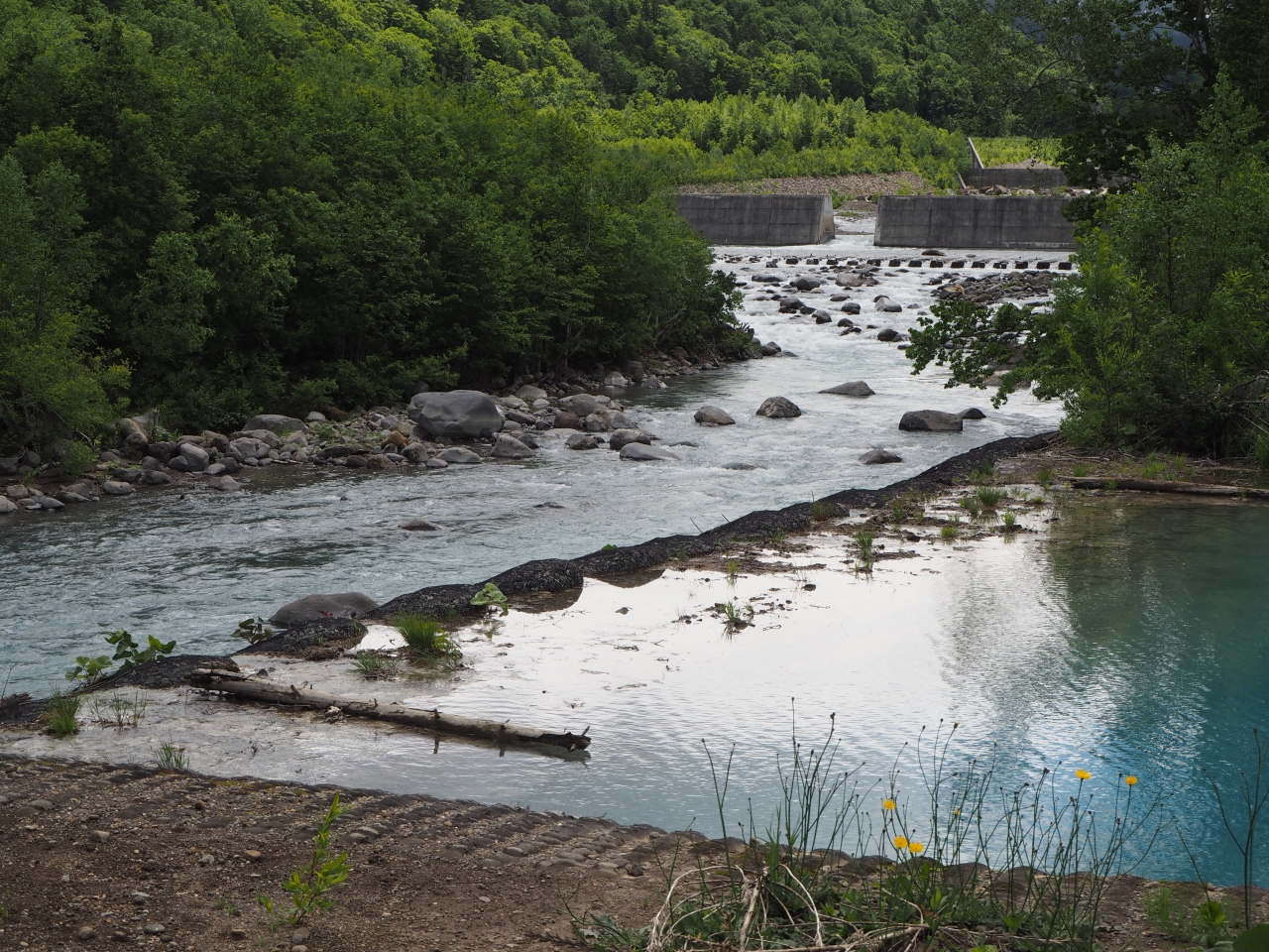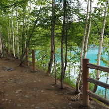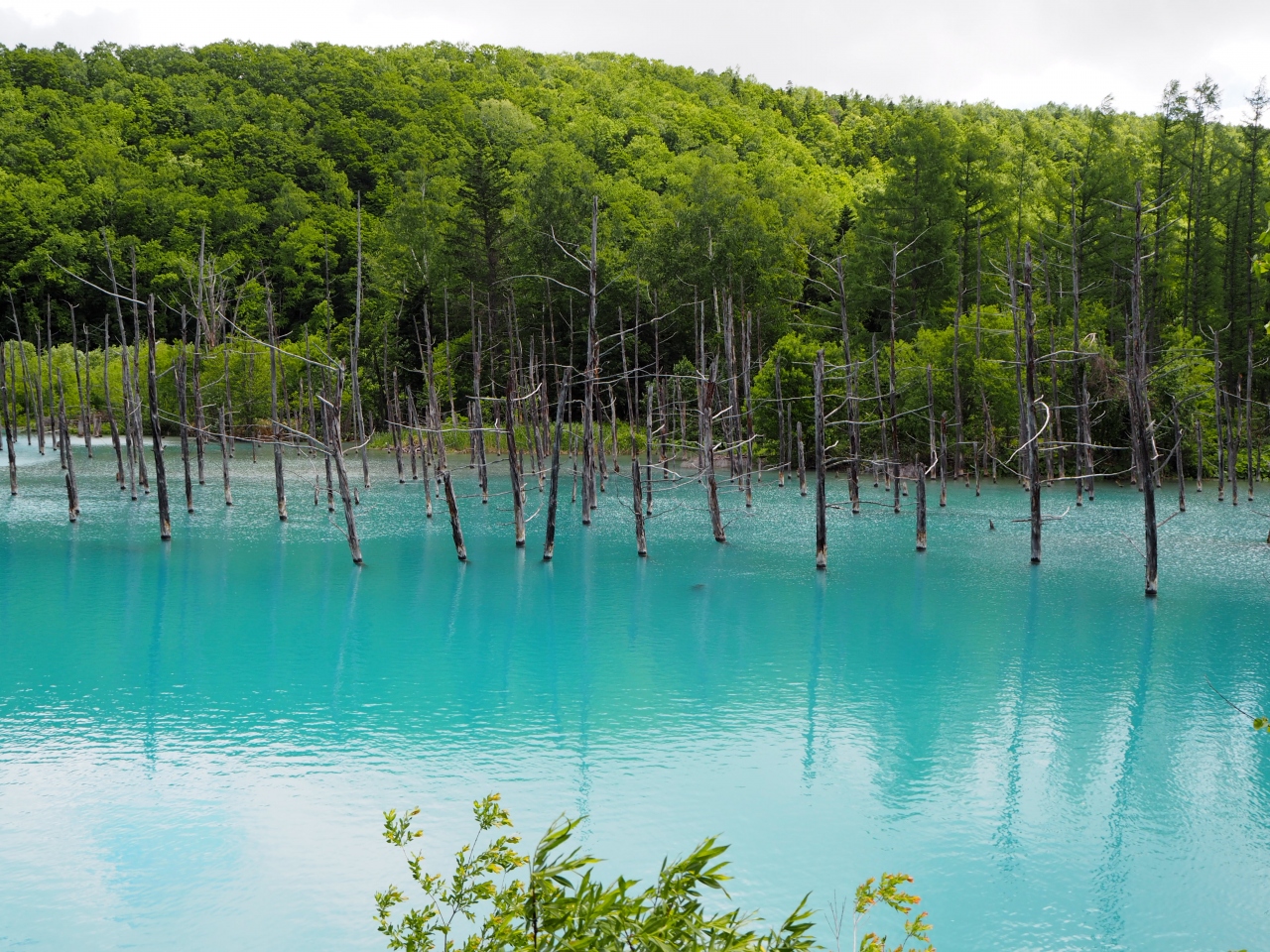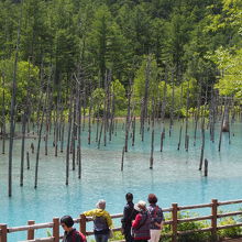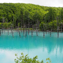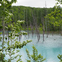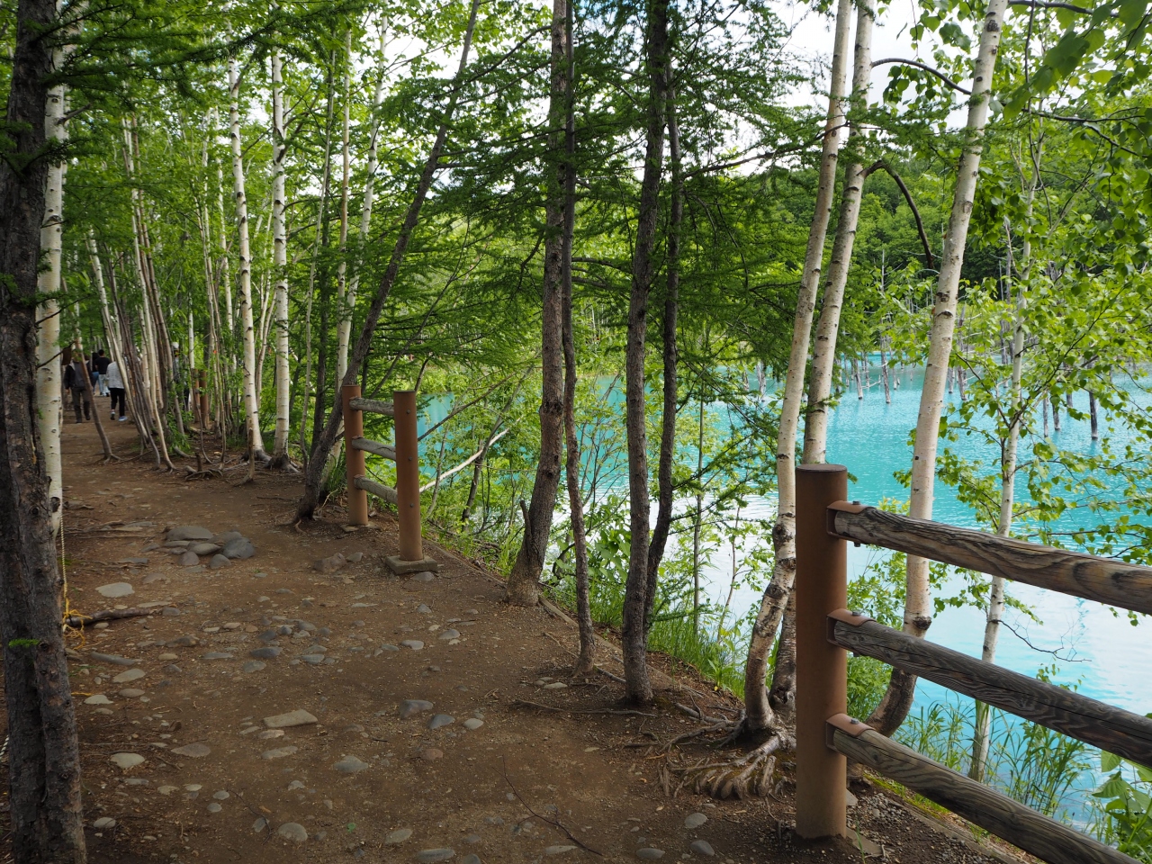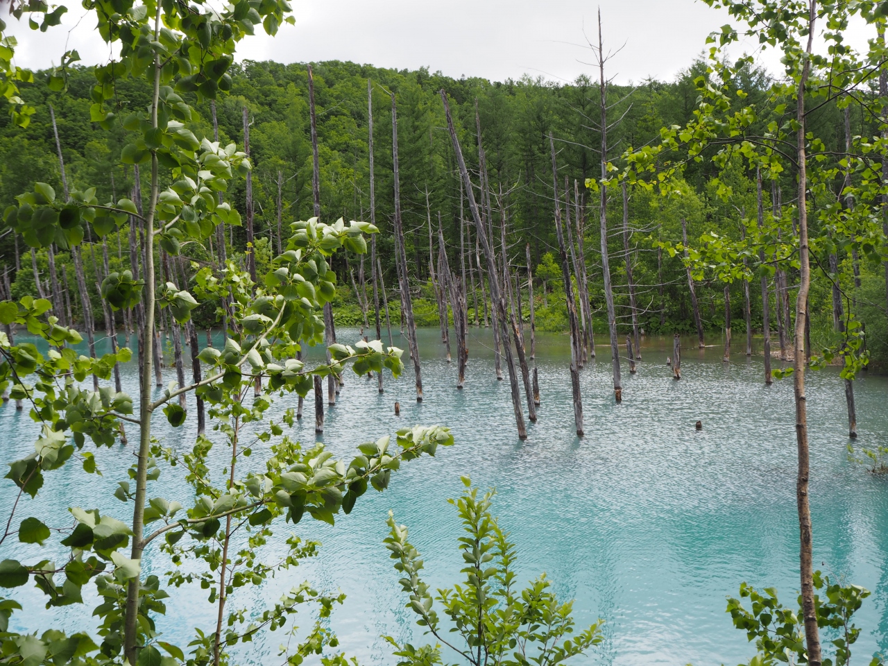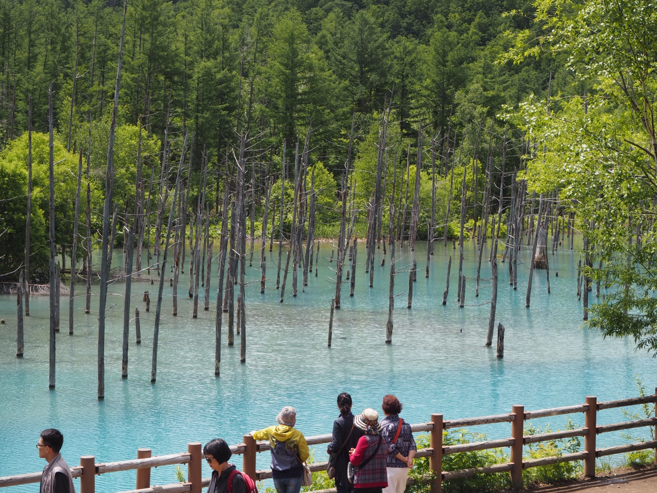 美瑛町郊外の人気の観光スポットです。札幌からも日帰りの観光バスがあります。午前10時過ぎですが、青い池に隣接している駐車場には10台近い観光バスが停車していました。青い池は十勝岳の噴火に対する火山岩、火山灰などの大量の土砂が下流へと流れ落ちるのを防ぐために築かれた堰にできた池です。池は火山成分の鉱物が含まれているのか、池の水は青い色合いをしています。池の水の色は光の当たり具合で変化するようで、晴れた晴天の日にはより青みが増しそうです。青い池には半枯れの白樺の木が立ち並んでいるのも景観をより引き立てています。みんなたくさんの写真を撮っていました。
