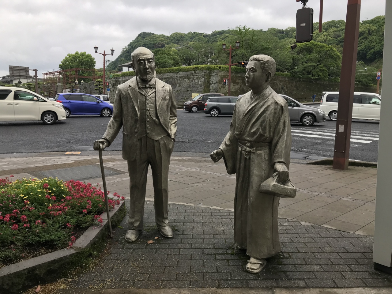 西南戦争の銃痕が残る石垣の近くに銅像があります。ウィリアム・ウィリスは鹿児島の近代医学の先駆者です。戊辰戦争では敵味方の区別なしに治療を施し、赤十字の精神を日本に伝えたという、日本にとって重要な役割をした人物です。銅像の横には、薩摩年表とウィリスとタカギについての簡潔な解説版がありました。