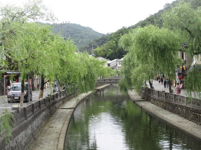 城崎温泉の町並みの特徴は、川の両岸の柳の木です。青々とした葉の付いた枝が垂れ下がる風景は絵になります。あとこの川にたくさんの橋が架かっているのですが、ほとんど石造りで、欄干の内側に「重要文化財」と書いた青い看板が貼ってあります。素晴らしい風景です。