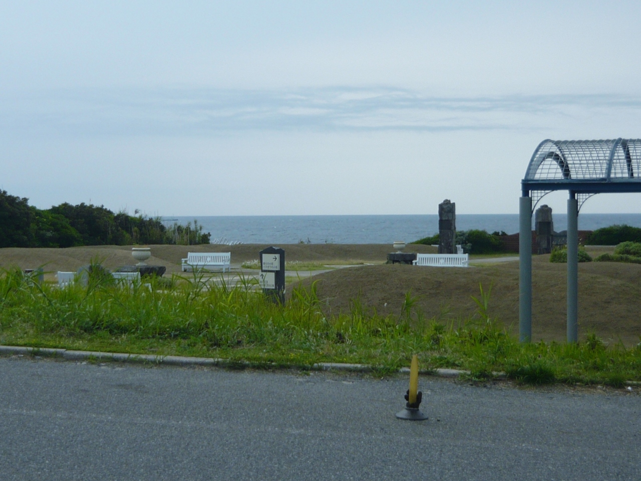 角島灯台公園に隣接した公園で、この種の公園としては珍しく西洋の庭園風な作りになっています。放射状に広がる8本の白いラインを持つ円形の石畳が2つ繋がっていて、円形の中央には白い大きな壺のオブジェがあります。このデザインが何を表すのかよく判りませんでしたが、公園には散策路や東屋、ベンチなども整備されていますので、海を見ながらのんびり散策されることをおすすめします。