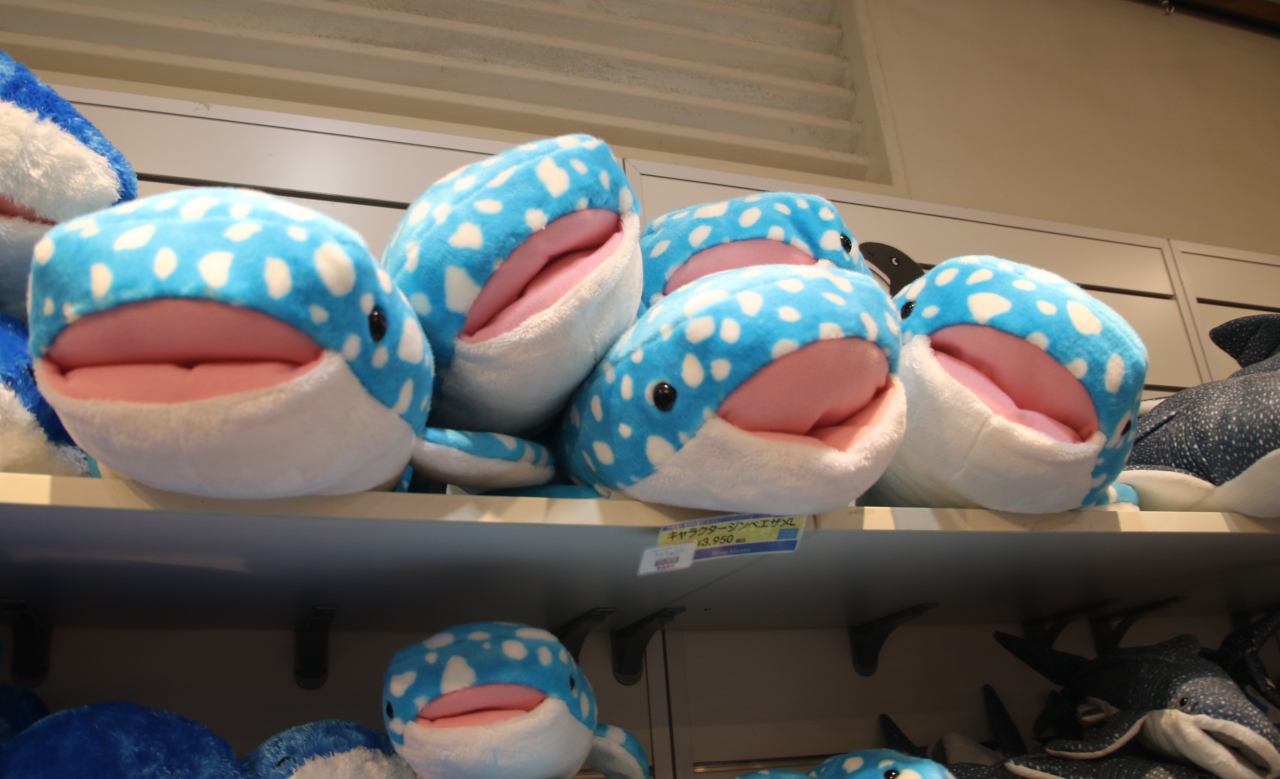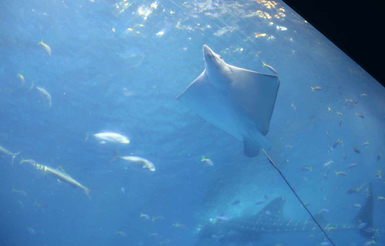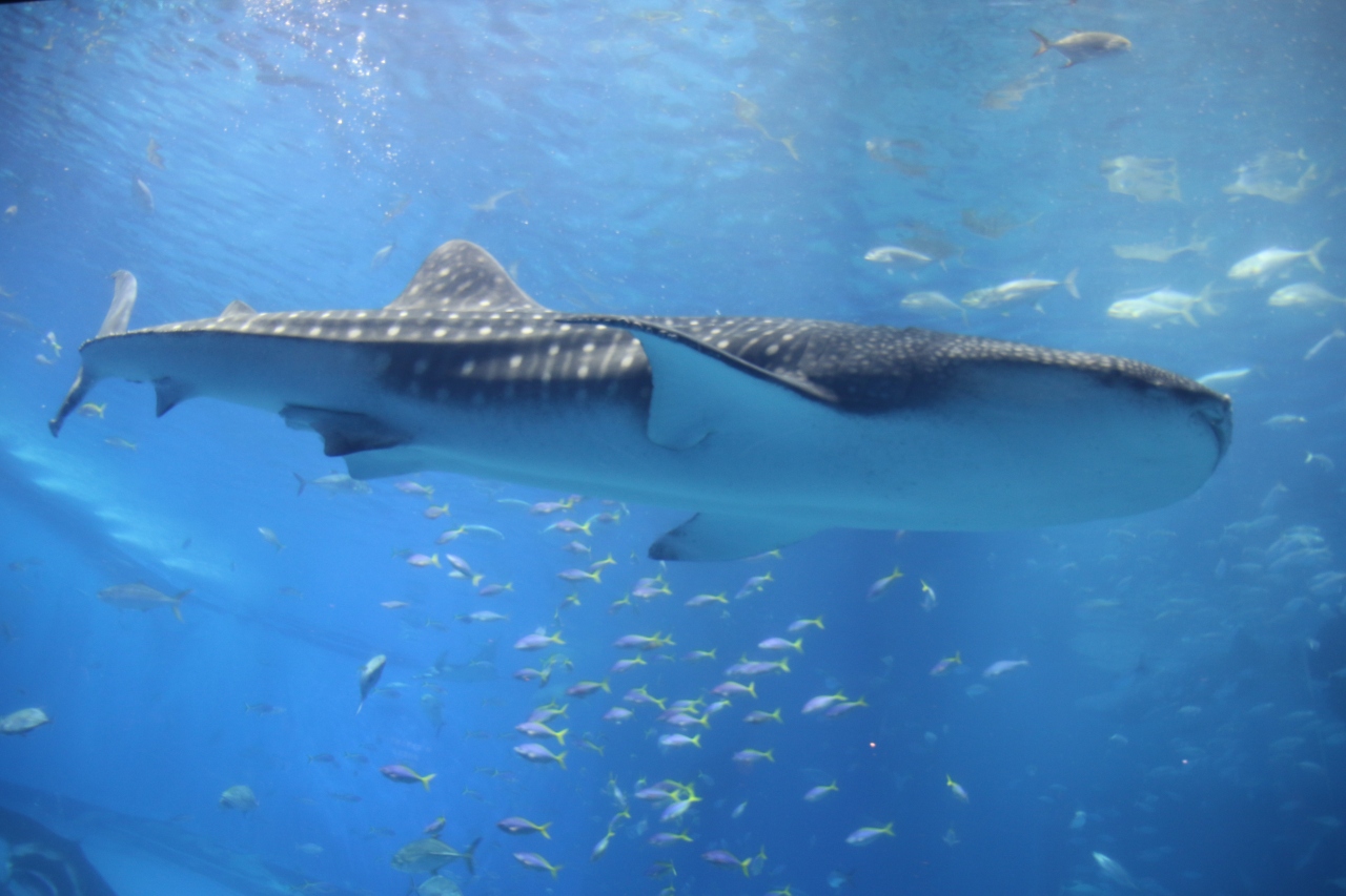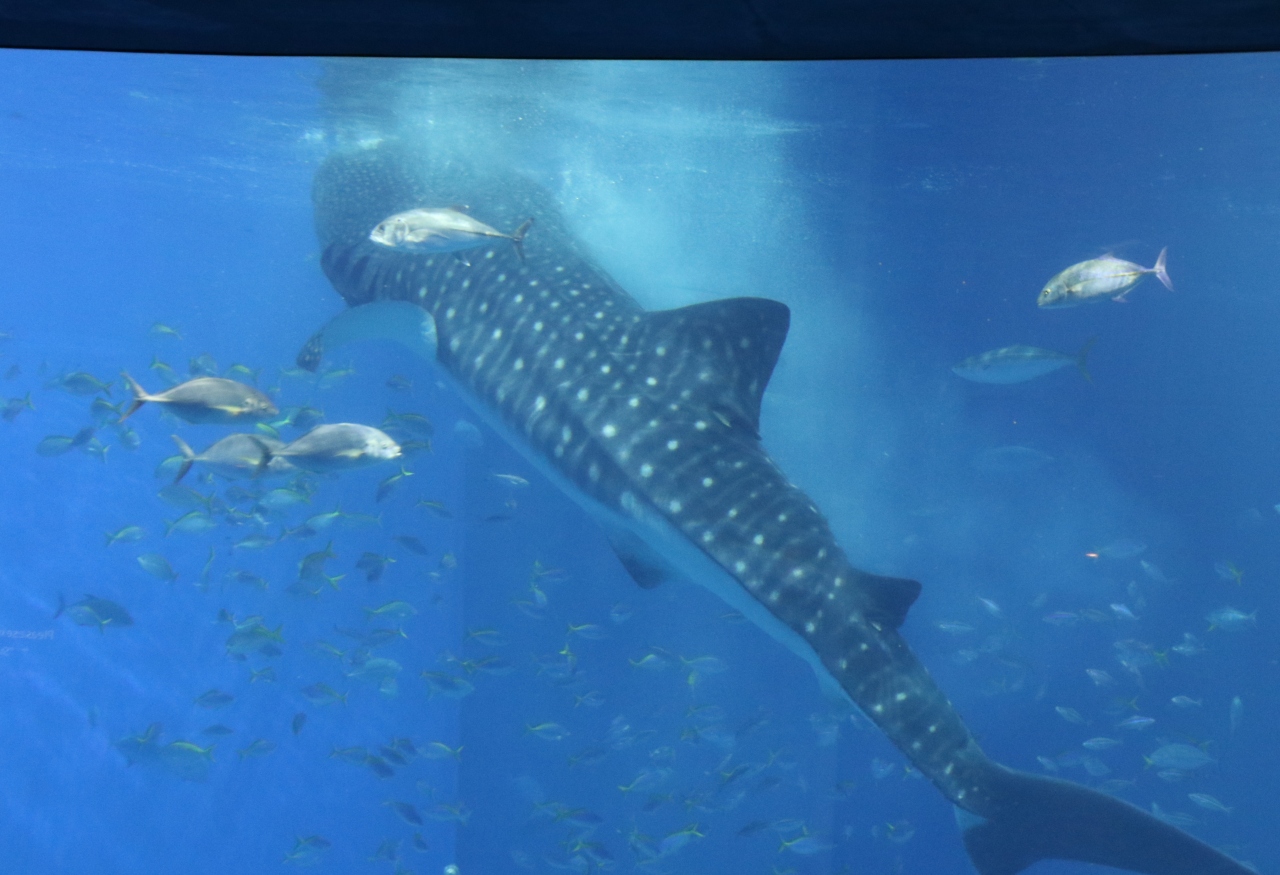 ジンベイザメのお食事タイム、大量のオキアミを丸呑みする姿が素晴らしい。大水槽のジンベイザメが一番目玉の水族館です。オキアミを丸呑みする姿を水槽の真上にあるカメラから映し出すモニター展示がとても斬新です。