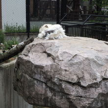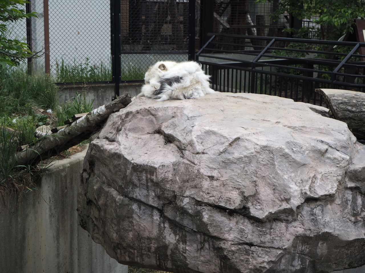 旭川動物園のホッキョクキツネです。園内のレッサーパンダ舎のとなです。ホッキョクキツネは白いふわふわの毛でおおわれていて、もこもこしている感じでした。ただ大きな石の上でじっとしていたので動いている様子は見れませんでした。これから温かい時期になり、季節の変わり目のためか、毛が一部抜けている(生え変わる)ようでした。