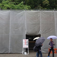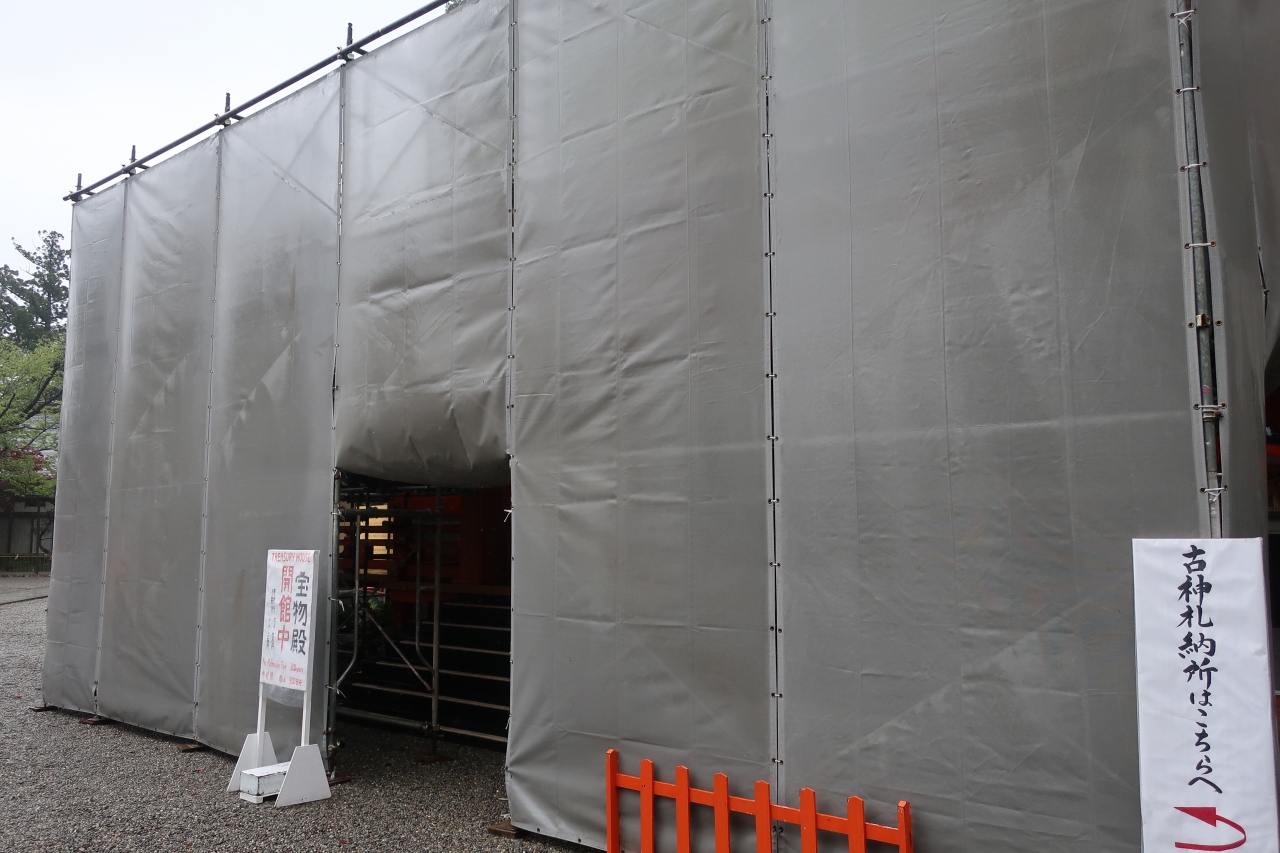 熊野那智大社の拝殿前右手、御縣彦社の隣にある建物が宝物殿です。さほど大きな建物ではありませんが、熊野那智大社文書、那智経塚の出土品などの宝物が展示されています。しかし、速玉大社の神宝館と比較すると、神宝館が国宝だれかなのに対し見劣りしてしまいます。現在宝物殿の外装は足場が組まれ工事中です。